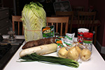 at c-mart i bought some ingredients for making korean kimchi. they had a sale on napa cabbage (38¢/lbs.), and i also picked up some garlic chives and a large daikon radish.
