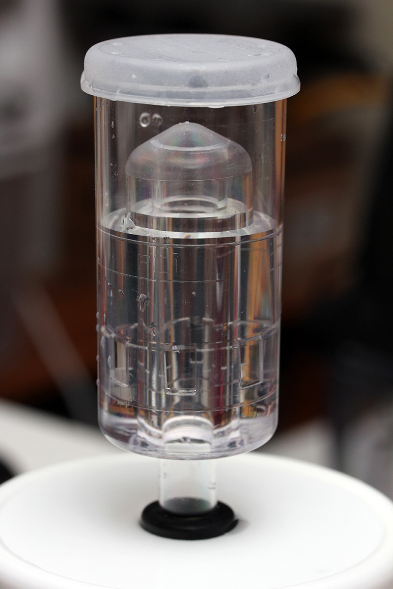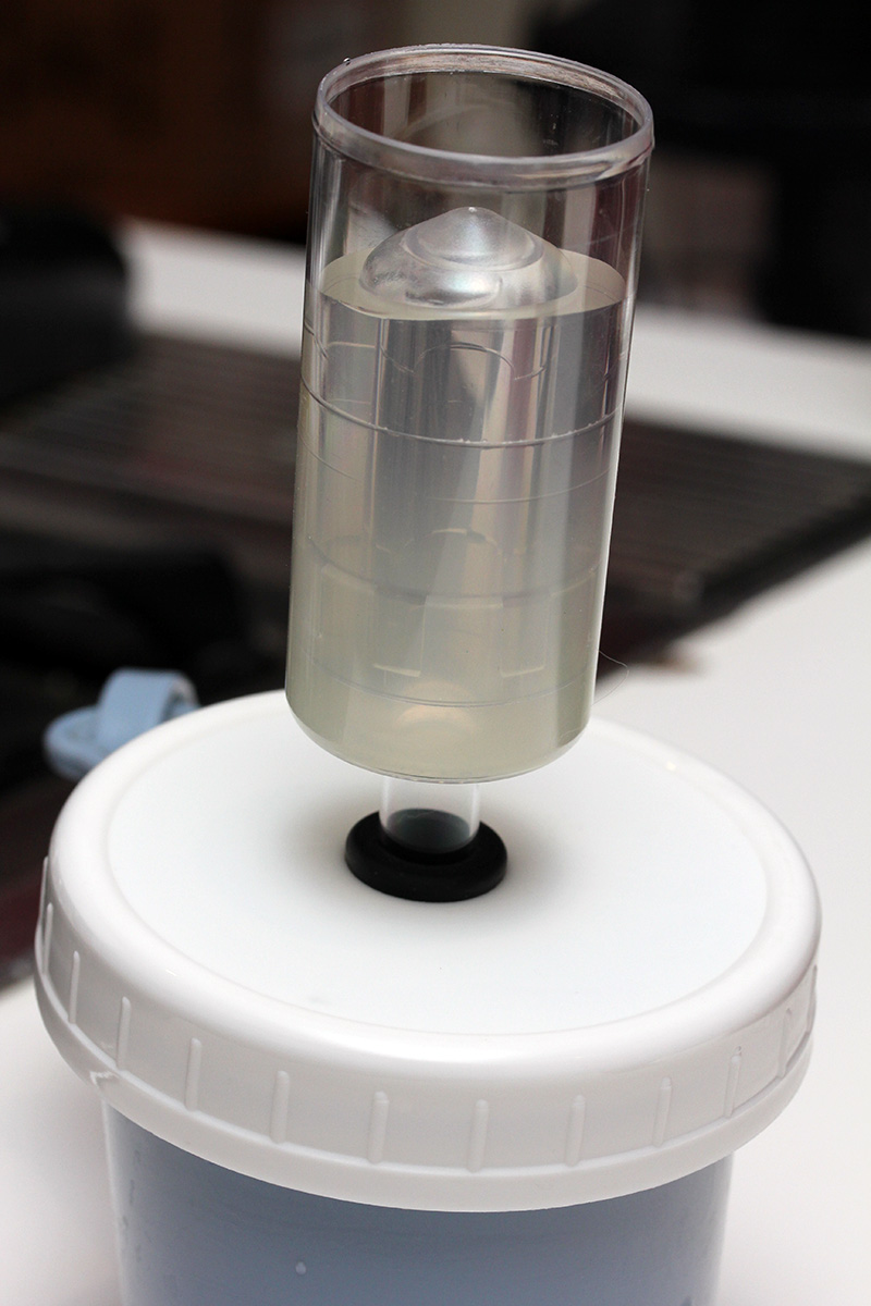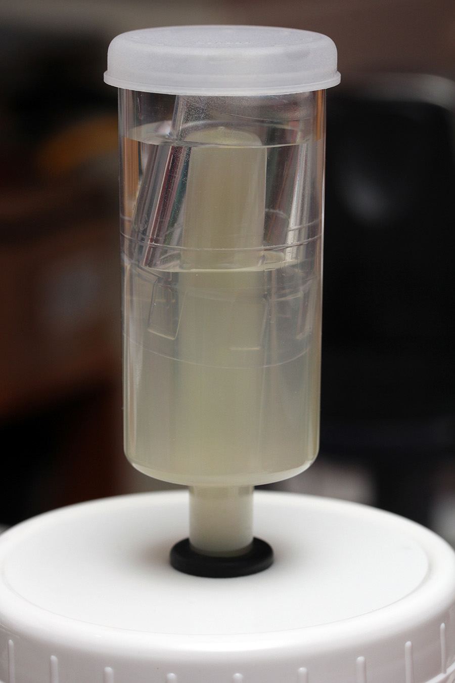 around 9pm i noticed something unusual was going on in the mason jar airlock. cabbage juice seemed to have push out from the jar into the airlock itself, in the form of a milky yellow liquid. 30 minutes later i saw the water level inside was even higher than before. soon it'd overflow.