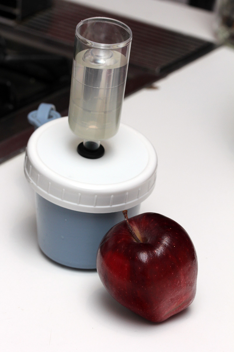 the problem was i needed some sort of weight to keep the sauerkraut down. without something to keep it down, all the carbon dioxide produced from fermentation will push up the sauerkraut, forcing the liquid into the airlock, and then out. i didn't have anything i could use, but i read that a thick slice of apple might do the trick. just so happens freddy left a bag of apples in the fridge. i cut a slice, pushed down the sauerkraut, poured out some liquid, then added the apple weight. hopefully this will keep the airlock from overflowing again.