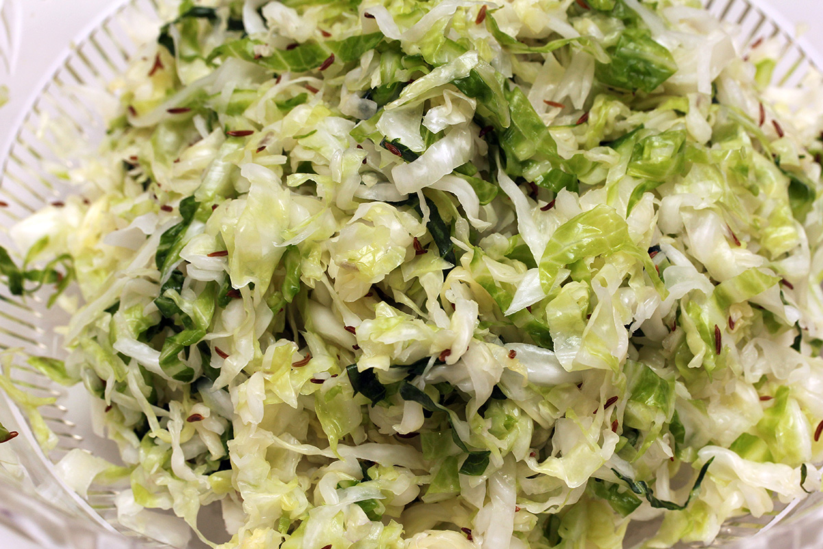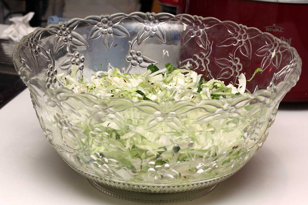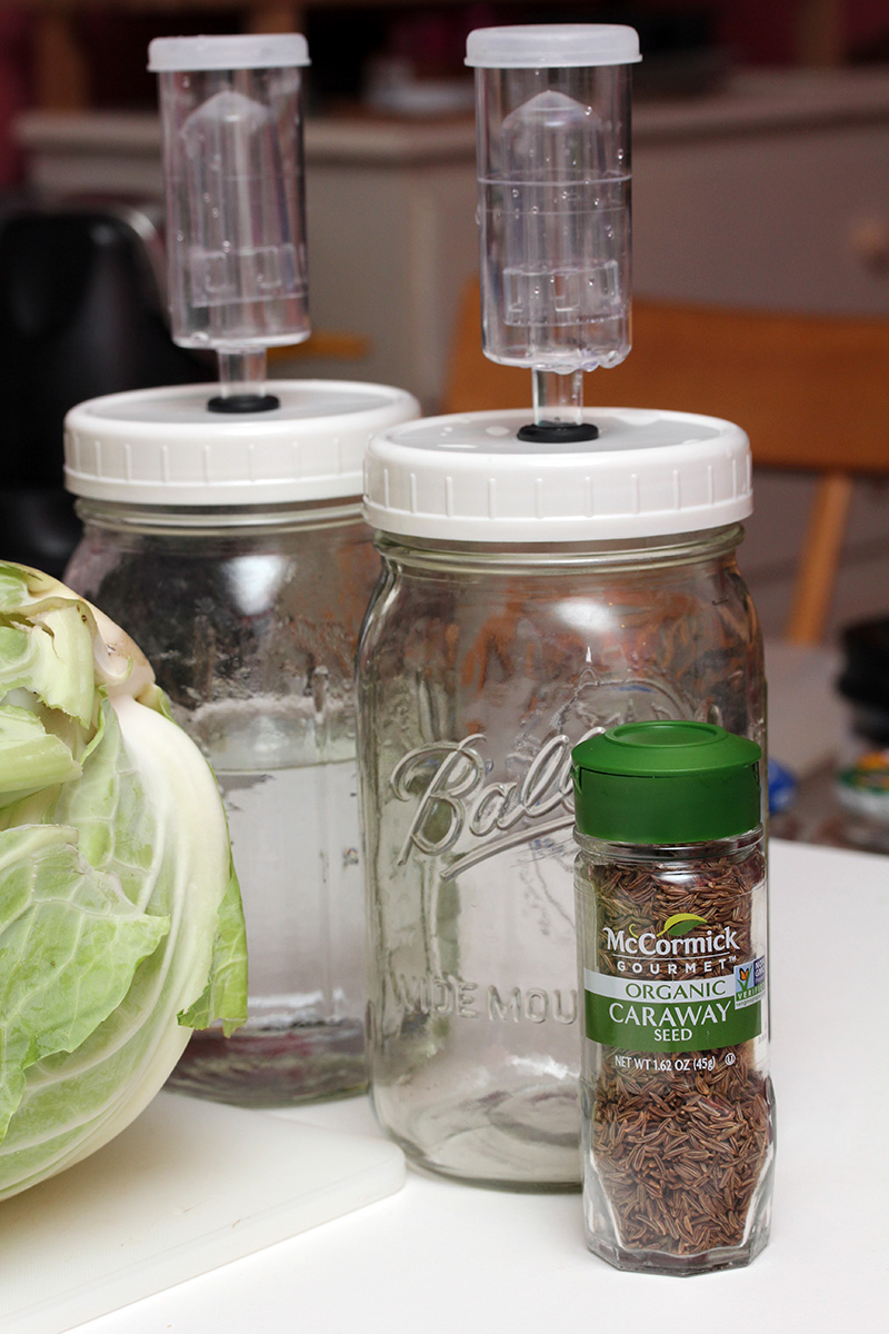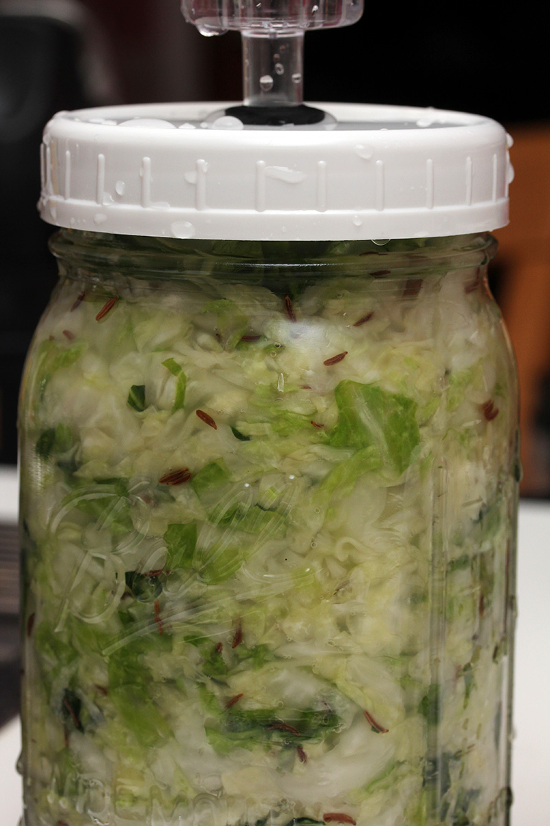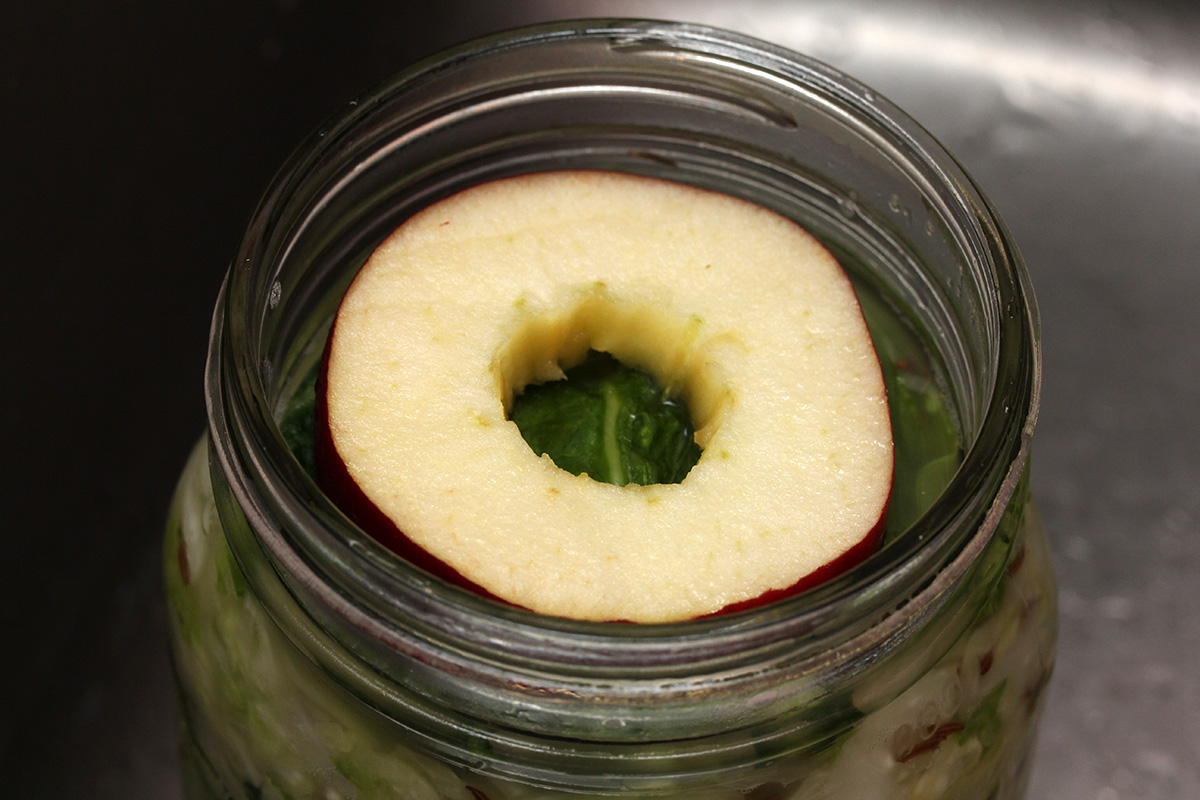 1 green cabbage (2.49 lb.), shredded 1 tbsp sea salt1 1 tbsp caraway seeds 1 apple, sliced (for weight) |
