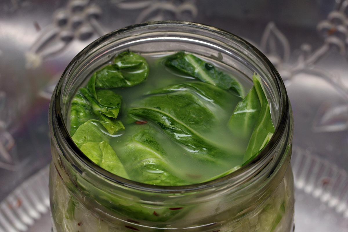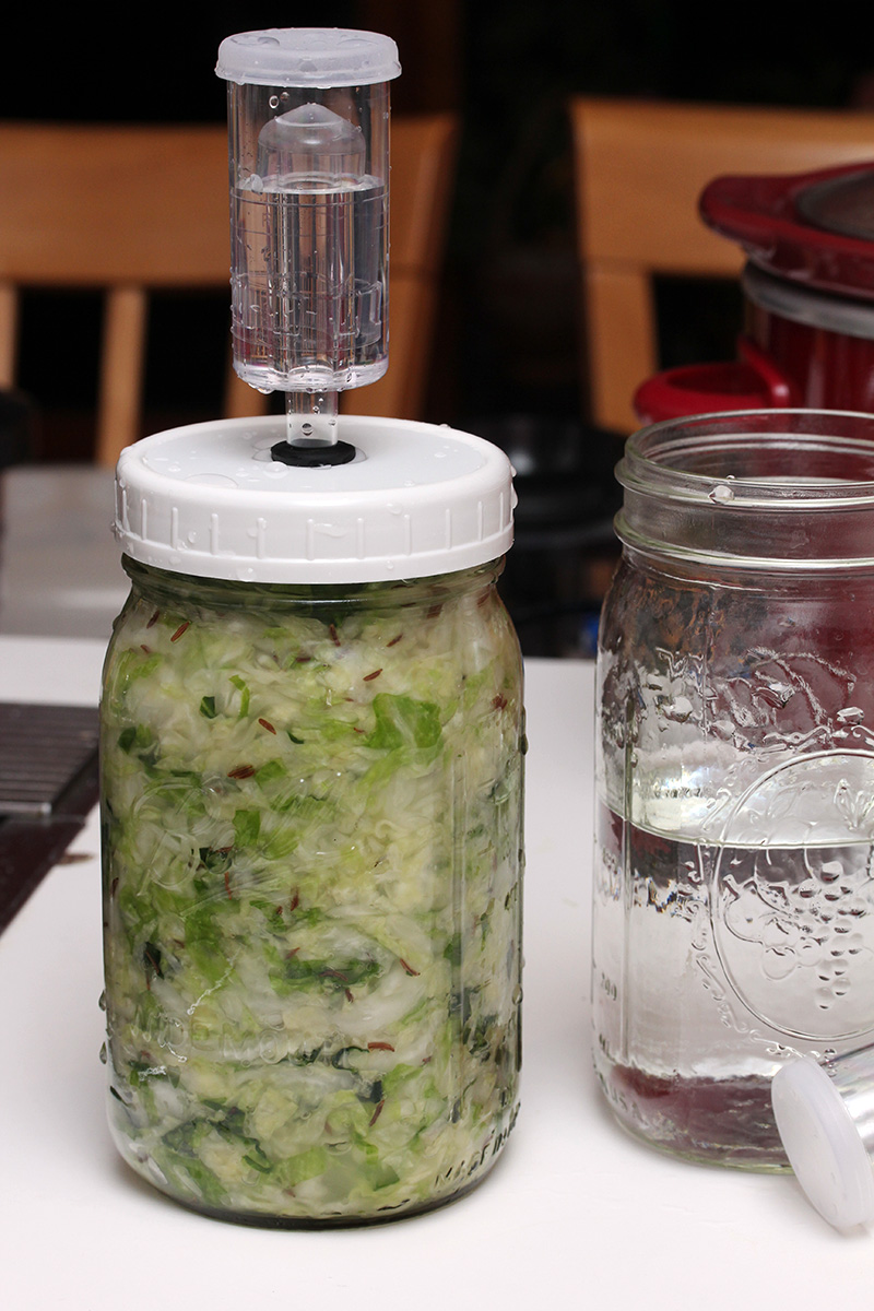 an hour later the cabbage had reduced in size by about a half. i mixed everything again, squeezing and massaging the cabbage to make it more compact, before i started packing the cabbage into the 1-quart mason jar. it didn't seem like everything would fit, and i kept compacting the cabbage in the jar to make more room, until finally i managed to get all of it inside. i saved a piece of cabbage leaf earlier to use as a cover to prevent the shredded sauerkraut from floating up. i then screwed on the lid and added purified water (i.e. boiled then let cool overnight) to the airlock. let the fermenting begin!