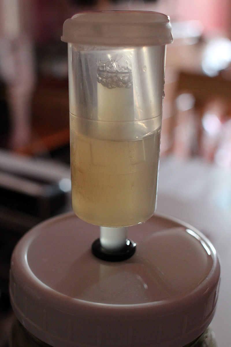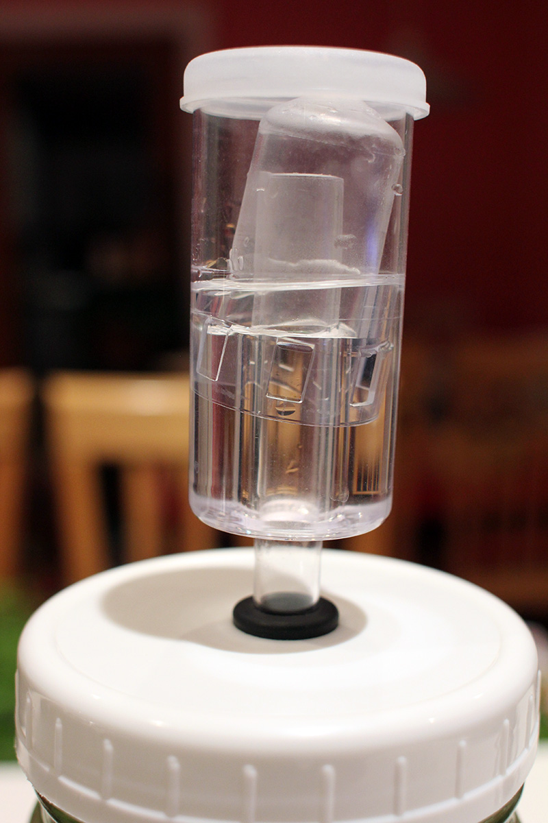 the mason jar airlock seems to be doing well, no overflow since i cleaned it this weekend. carbon dioxide was still being produced because the bell was pushed all the way up to the airlock lid. this is just the first day so some heavy fermentation is to be expected.