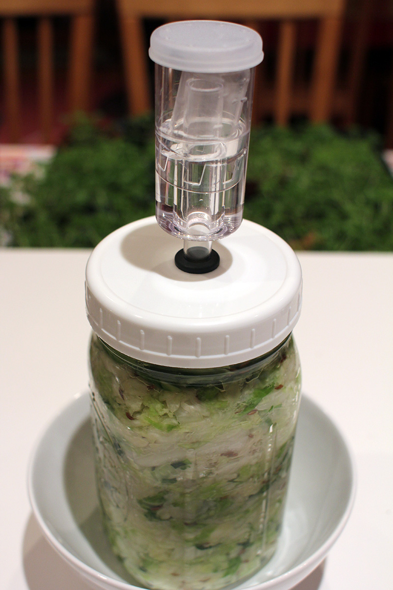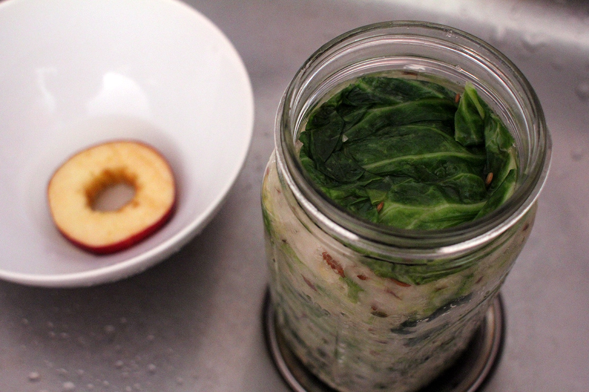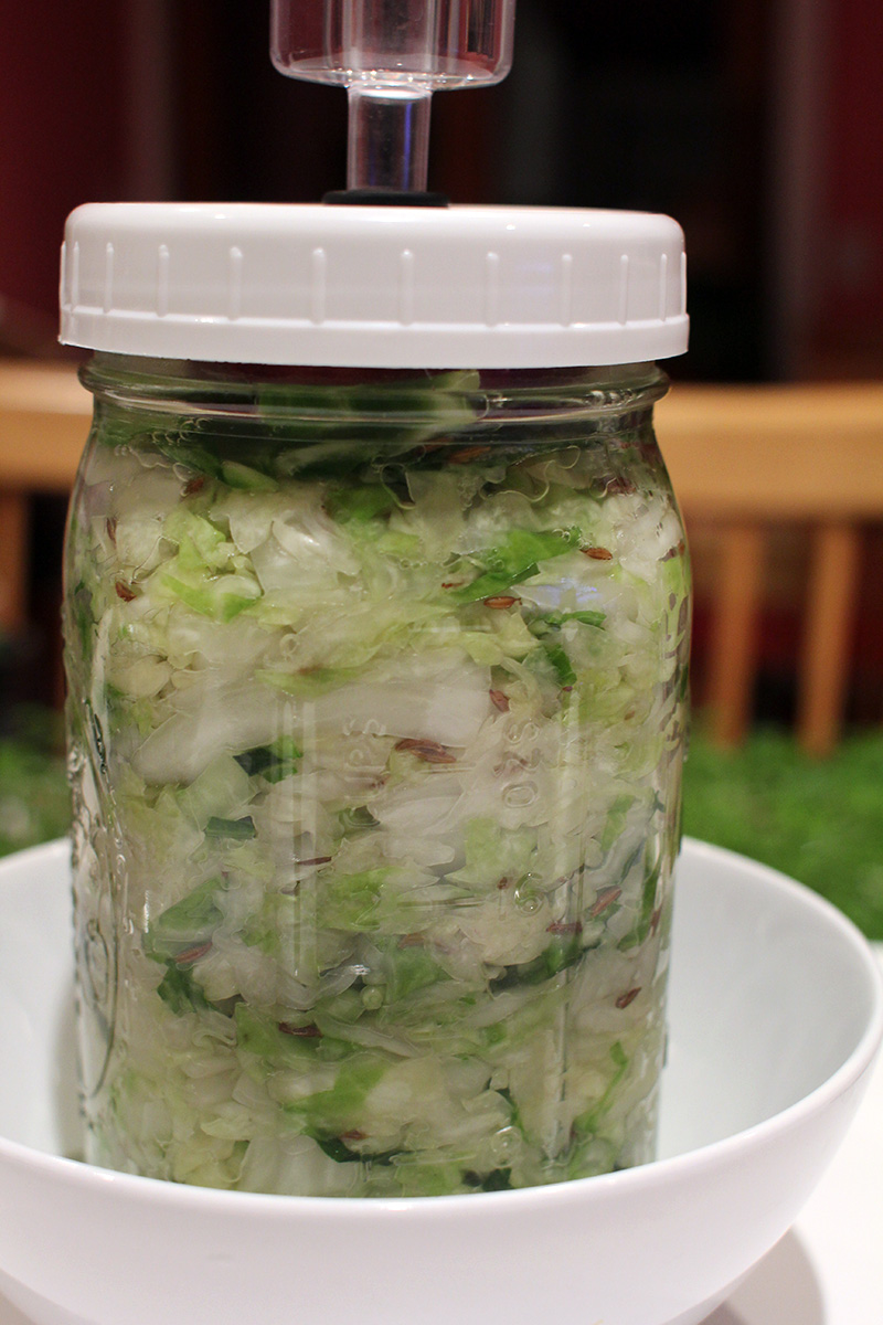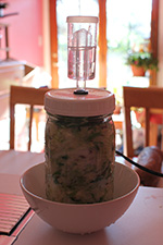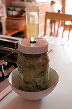 the apple weight didn't work because the fermenting mason jar overflowed this morning. luckily i had the whole setup in a bowl, so the cabbage juice didn't get everywhere. there was nothing to do but to remove the lid, clean the airlock, push down the sauerkraut and drain the excess fluid, and put everything back together again.