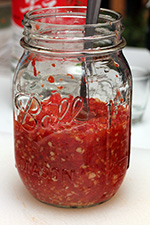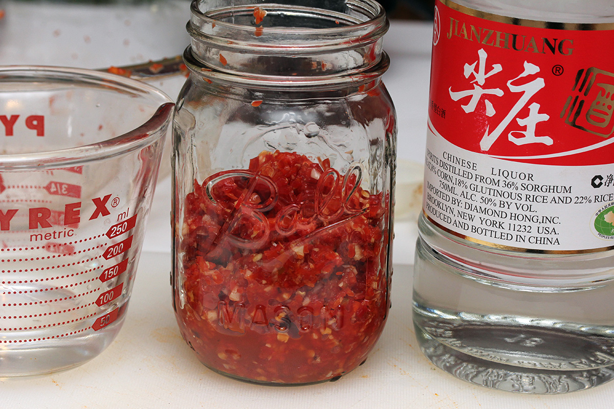 originally i was going to add 1 cup of baijiu, but that seemed excessive and might end up drowning the other ingredients. i think pepper plus garlic plus salt is enough for a good hot sauce, nothing else needs to be added. but i figured the baijiu would add another layer of flavor, and might help (or hurt) the fermentation. i went with 1/4 cup of baijiu, which even that seems like too much. if this recipe goes well, i might reduce the alcohol even more for future batches. i scooped everything inside a pint jar.