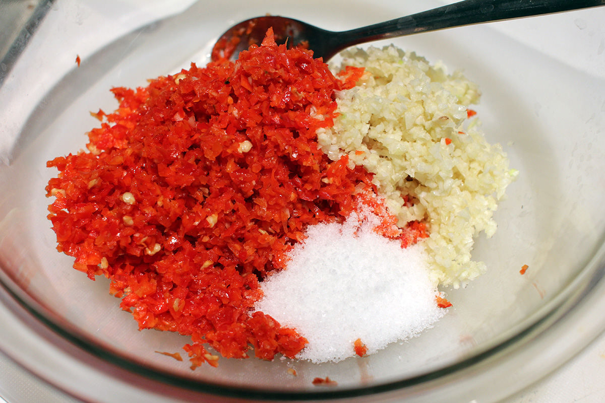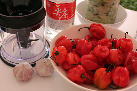 i was going to use all up the scotch bonnets to make a large batch of hot sauce, but decided to split peppers so i could experiment with two different flavors. after reading a bunch of recipes, i came up with a simple myself: chop up half the peppers (14) with a food processor, likewise do the same with a whole head of garlic (10 cloves), then add a tbsp of fine sea salt and 1/4 cup of chinese baijiu.