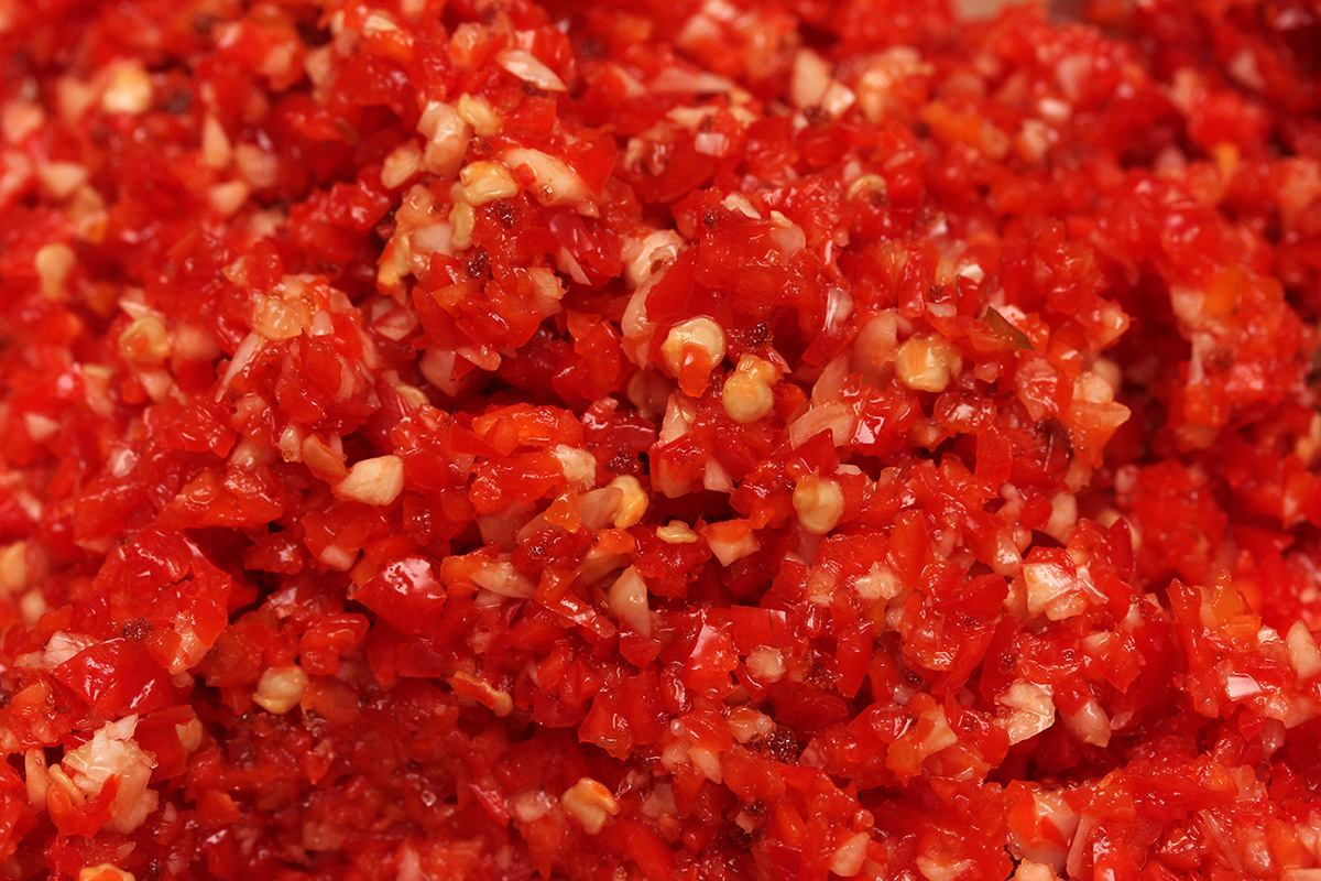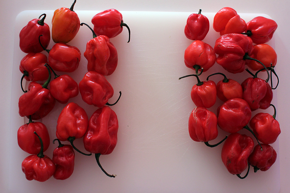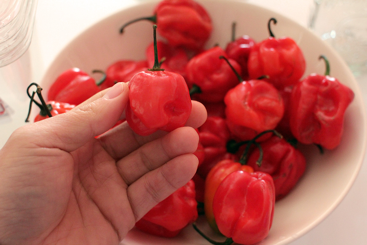 when i chopped up the scott bonnets the smell was insane, at times fragrant yet scary but i could sense how hot it was. even after washing the utensils and containers, they were still incredibly spicy when i test licked them. i knew i had small microscopic cuts on my hands but suddenly they hurt like somebody poured acid into them. at one time i even choked from the fumes, coughing and tearing up.