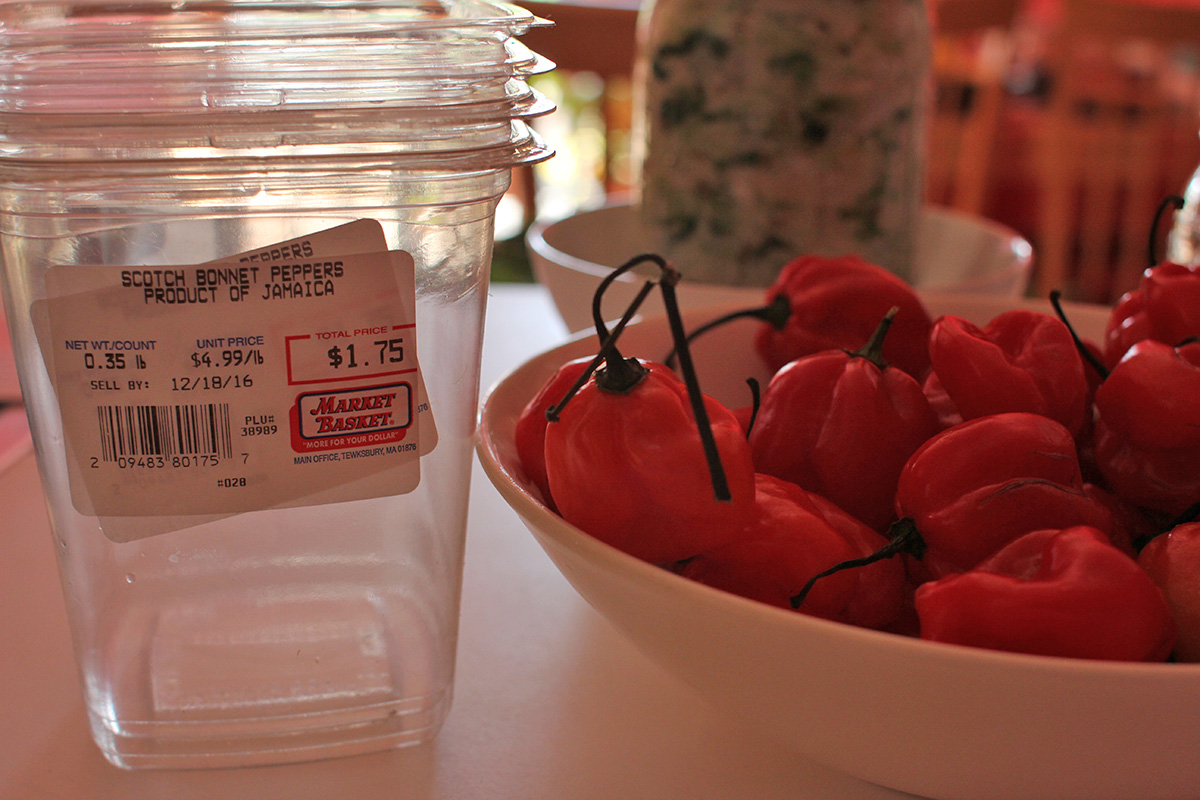 for lunch i heated up some more chicken corn chowder, before starting on my hot sauce recipe in the early afternoon. i bought 2 containers of scotch bonnet the same day i got all those ingredients for the chowder and sauerkraut. i thought they were on sale because they were in the past-due shelf, but they were just regular price, $4.99/lb. i ended up getting 2/3 lbs ($1.75/container).