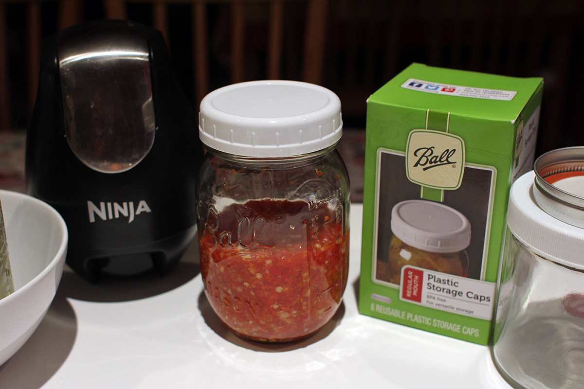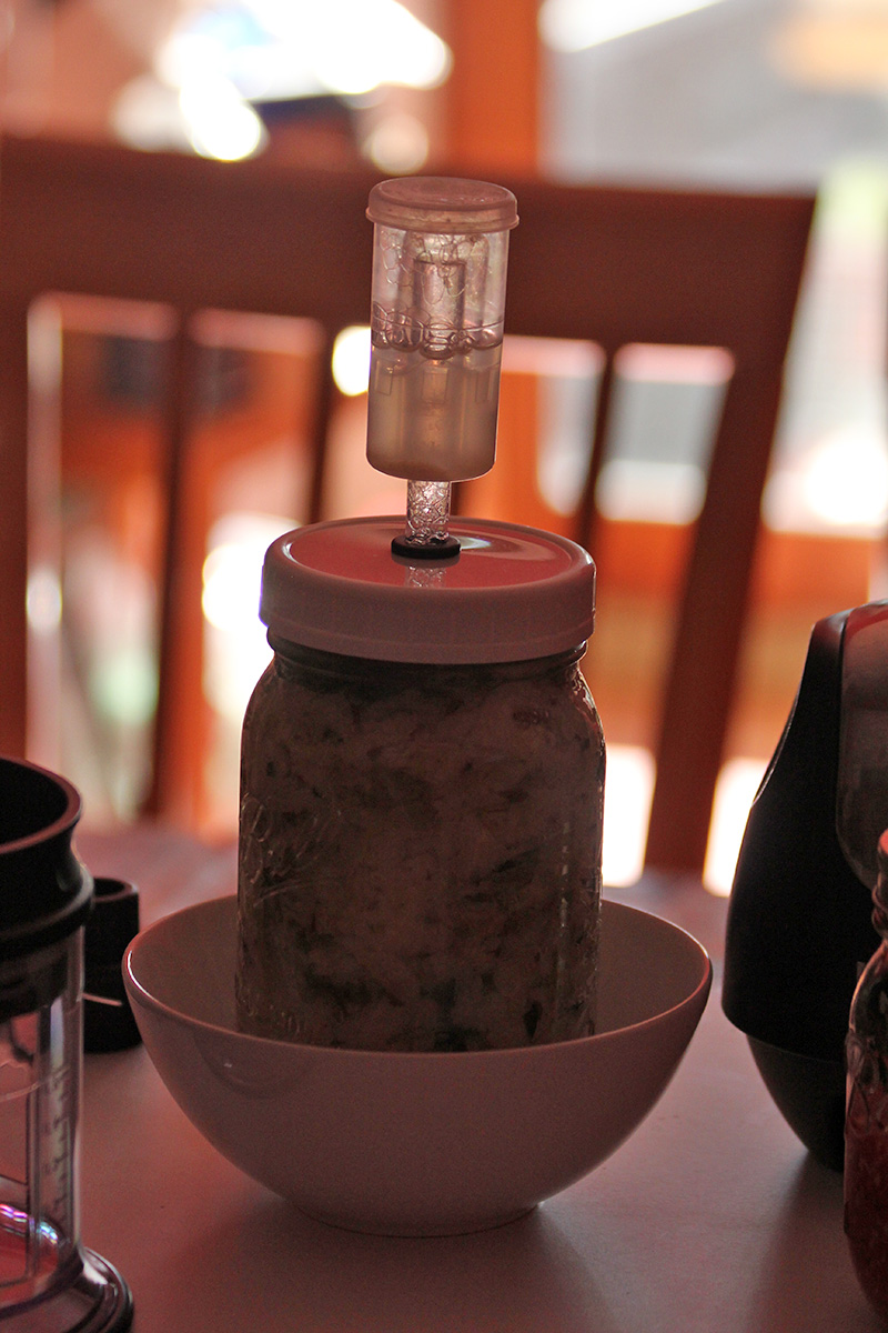 it's day 6 of the sauerkraut ferment. the days of leaking airlocks are over. now my latest concern is whether or not mold will be growing on the piece of apple weight, since it's not submerged in brine juice, and just sitting on top of the sauerkraut. i can already see a little something that could be mold forming.