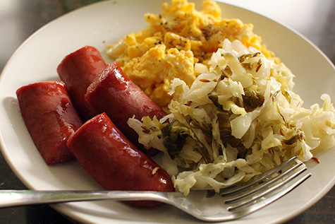 for lunch i fixed myself some beef kielbasa paired up with my homemade sauerkraut, along with some scrambled eggs and a glass of fruit smoothie. super satisfying, the only thing missing was some starch (like home fries).