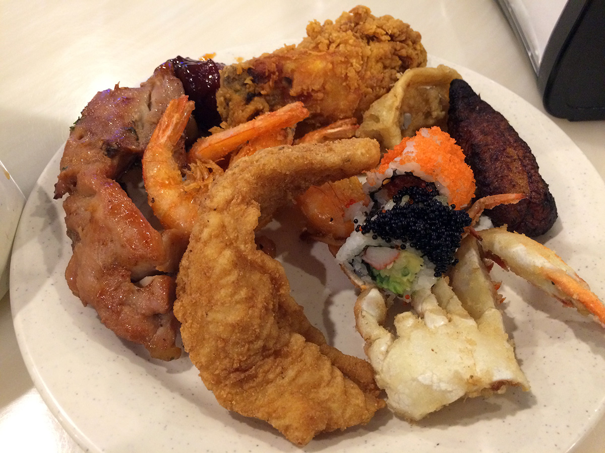 just like last time, i managed to eat 5 plates of food, with the final plate being mostly dessert items. the place was busy, and what was really interesting was nearly everyone was a minority of some kind, whether black, hispanic, or asian. i also saw some muslims with headscarves. all zero white people. buffets like this caters to the ethnic poor looking for a bargain. at only $13/person, you compare that to the restaurant i ate at a few nights ago, where $13 couldn't even get you a plate of macaroni and cheese. it's just a whole different social-economic world. the cost to feed a party of 7 on a friday night was only $100. my aunt treated, and was shocked by how inexpensive it was.