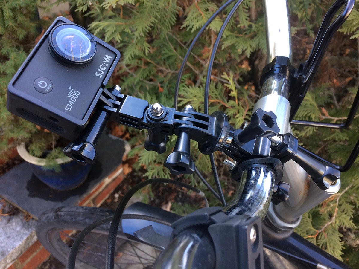 i had the idea of rigging up an armature to take a selfie video as i rode the bike to belmont. i tried something similar, last year, but the view was from the back with the camera mounted to a selfie stick which was in turn perpendicularly mounted to a tripod strapped to the rear rack. it wasn't a good setup because the camera wasn't back far enough and my backpack blocked any view of myself. this time i used some link armature components but as much as i extended it, it was still too short. so i had a good view of myself, but then mostly sky.