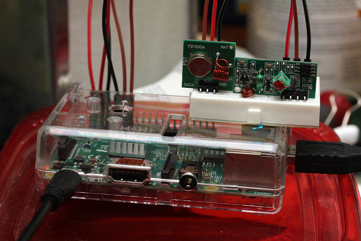 next i installed some software. first was wiringPi; not really sure what it does, but many 433 MHz tools require it, so i installed it. then i installed the 433Utils. i couldn't get the code to compile until i redownloaded all the files again using git clone --recursive git://github.com/ninjablocks/433Utils.git to recursively download the rc-switch submodule as well. that compiled successfully, and i was able to run sudo ./RFSniffer to receive the 6-digit on/off codes from my light switch remote. the 433MHz receiver has a very short range - just a few inches - i basically had to point the remote next to the module. next i tried running codesend but it didn't do anything. either the code didn't work, or maybe the transmitting module was broken.