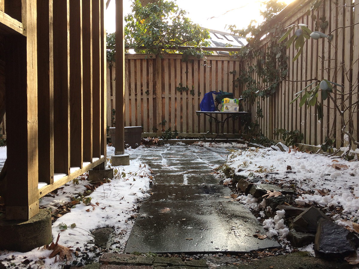 i wasn't expecting to see snow this morning. don had already shoveled his portion of the sidewalk, so i felt obligated to do mine as well. there wasn't a lot of snow, maybe a centimeter at most, but with the temperature hovering below the freezing mark, none of it was going to melt anytime soon. most nearby neighbors didn't bother shoveling their sidewalks, but i did mine anyway, despite having a hard time because there had already been traffic on it and much of the snow was already compacted. i also noticed that weren't any footprints on the front porch, meaning my upstairs neighbors weren't home, despite their cars parked outside. they probably weren't home yesterday, but i could've sworn i heard music, but maybe it was just my traumatized imagination playing tricks.