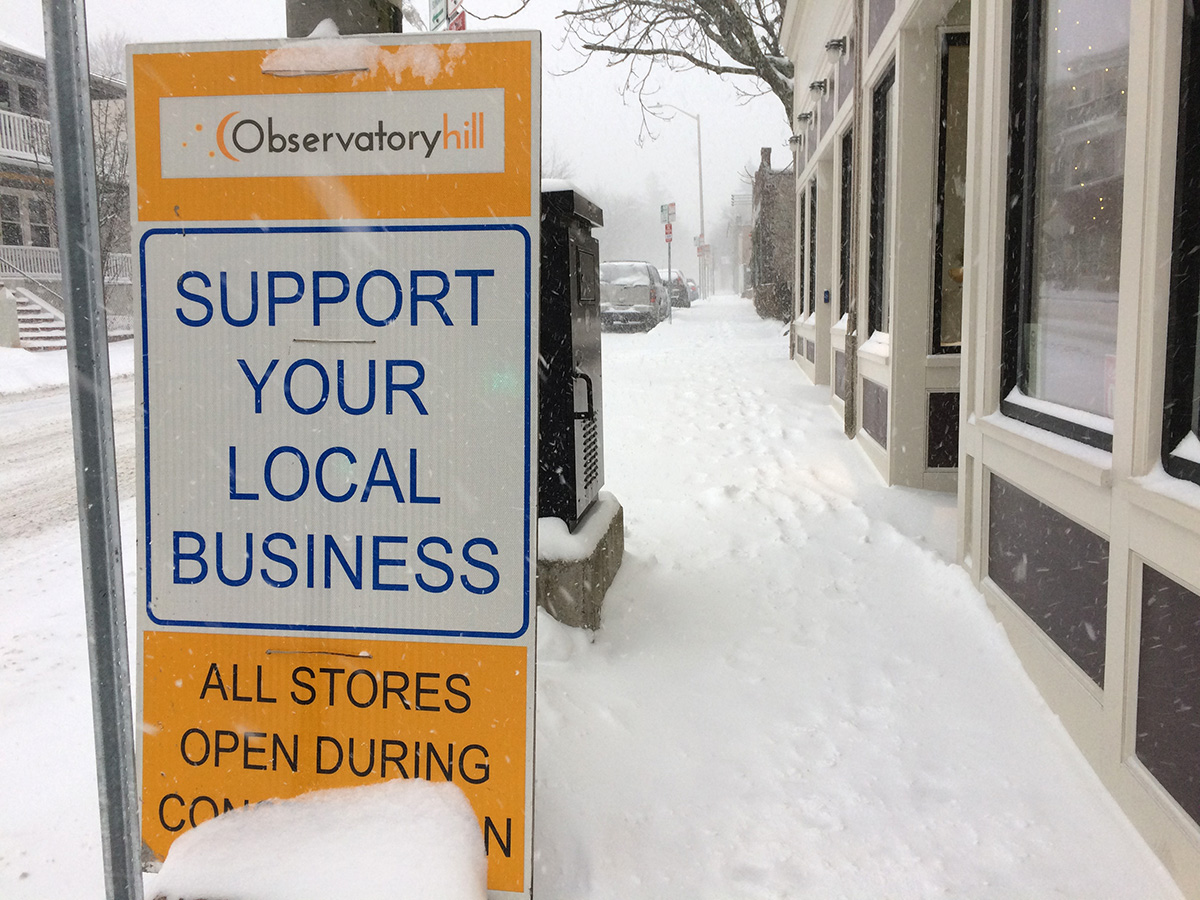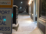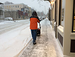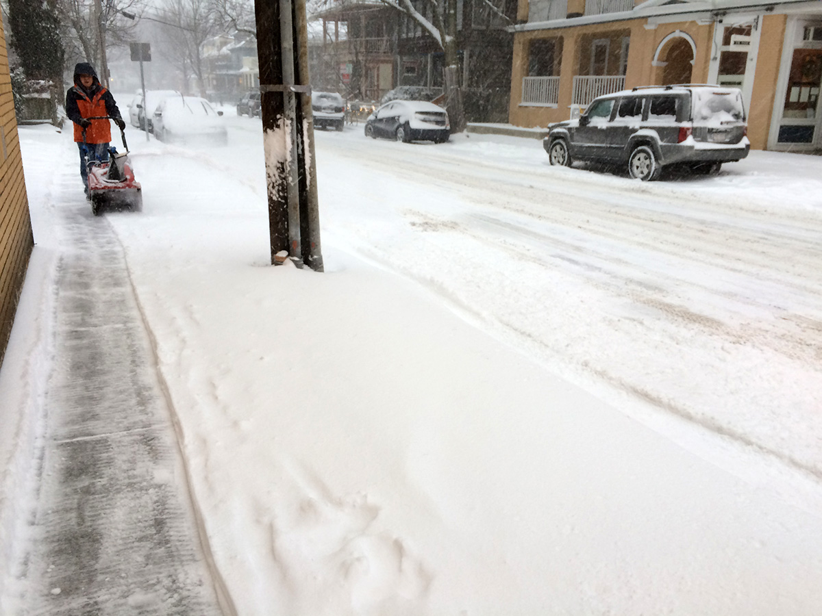 around 3:20pm my father and i went to the cafe. partly to pick up some ingredients for dinner, but also to get a headstart on the shoveling while there was some daylight instead of letting it pile up all the way into the evening. the accumulation wasn't too bad, and although people had already walked on the sidewalk, it was light enough that it'd either blow away or wasn't much of an obstacle. nevertheless, there was enough to plow. i went with my father to start the one-stage snowblower we have in storage in my grand uncle's backyard shed.
