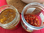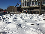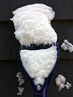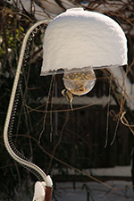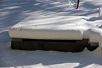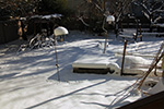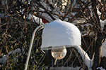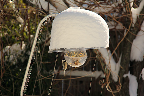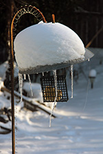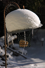 both feeders employ a dome baffle to keep off the elements. large mounds of snow ave collected on both baffles. the interesting thing is while the snow on one baffle remained solid, the snow on the other baffle was slowly melting for much of the day, leaving dangling icicles. the reason is because one baffle is completely clear, while the other is a solid grey that apparently absorbs enough of the sun's heat to melt the snow.