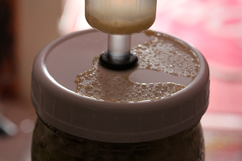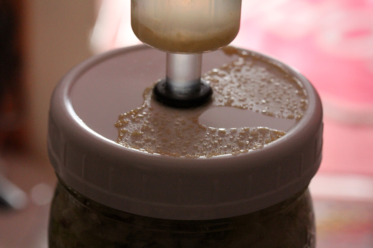 i'd forgotten about my 3rd batch of sauerkraut. feels like it's been fermenting a long time but it's only been 6 days. there was a crusty pool of dried salty sauerkraut juice on the fermenting jar lid. the airlock is still bubbling. i'm hoping to let this jar ferment for 3 weeks if possible.
