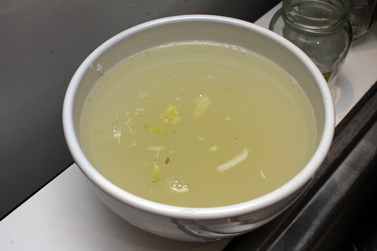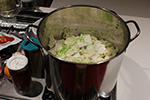 approaching 8pm i drained the reducing cabbage. the reason i do this is so that when i add the other ingredients, the kimchi doesn't become a soggy mess. i'm not making kimchi soup here! i managed to pour out a quart of cabbage juice. i saved it in a jar in case i needed to use it later, but the cabbage still retained enough juices so that it wasn't necessary. i then dumped the rest of the ingredients into the large stock pot (including 2 tbsp of salted shrimp paste and 12 tbsp of red pepper powder) and mixed everything by hand.