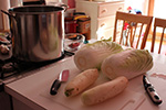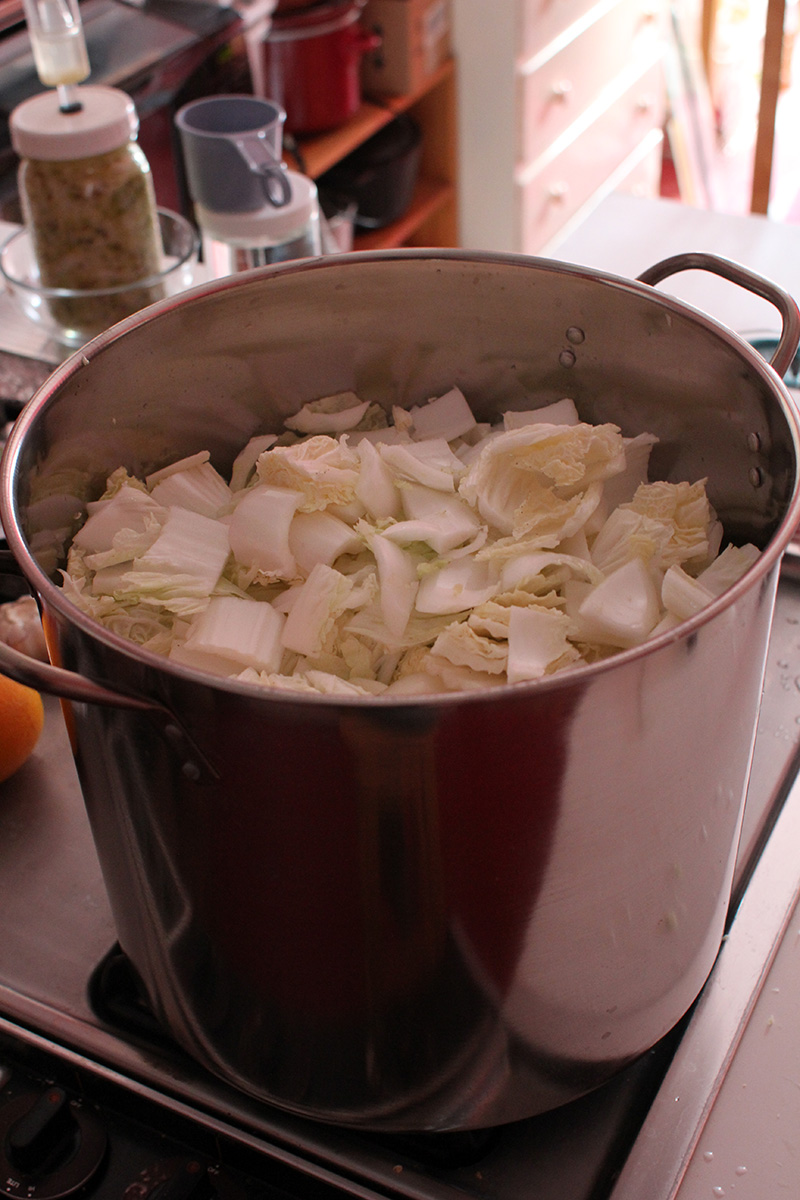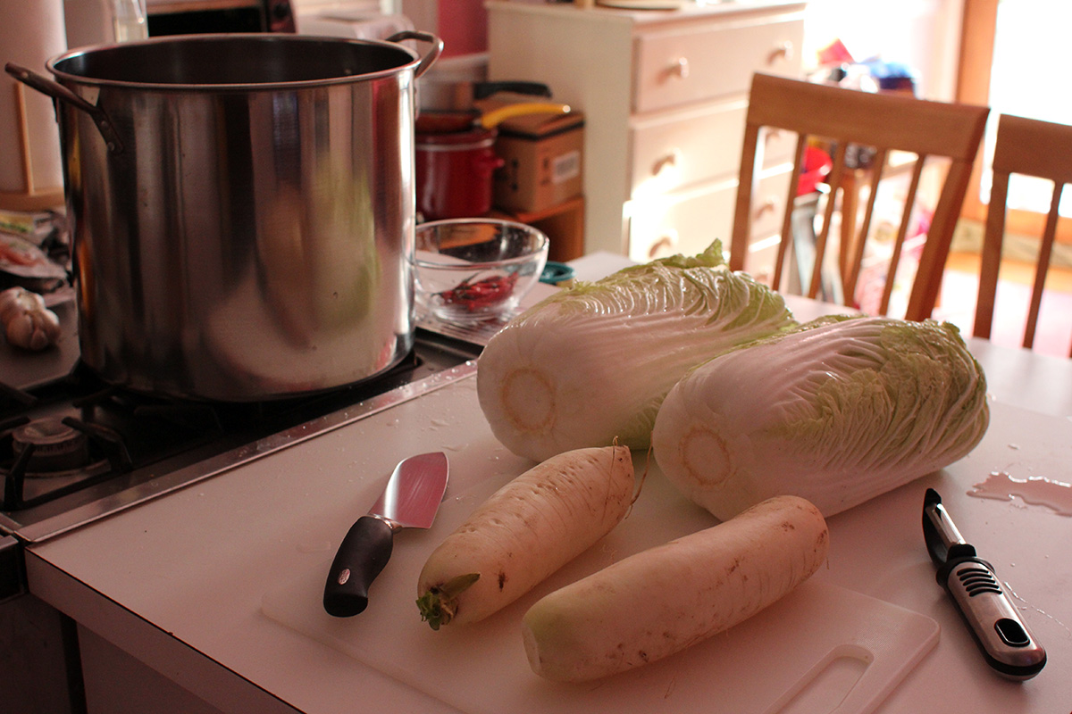 while heating up my final slice of leftover chicken pot pie for lunch in the early afternoon, i suddenly remembered that i was supposed to be making kimchi today. so i began at 1:30pm, keying on eye on the clock because i had to be at the cafe by 2:30pm.