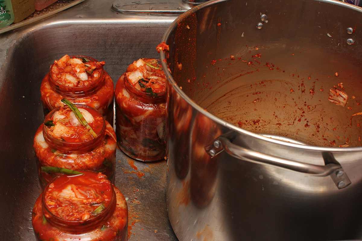 maybe next time i might wear a glove because the combination of salt and pepper always end up hurting the little cracks in my hand. i had slightly more kimchi than last time, so top of the 4 quart jars of kimchi, i also had enough for a small jar (grey poupon mustard jar). i capped the jars, washed them, then put them in lasagna trays to catch the leaking kimchi juices when they begin fermenting.
