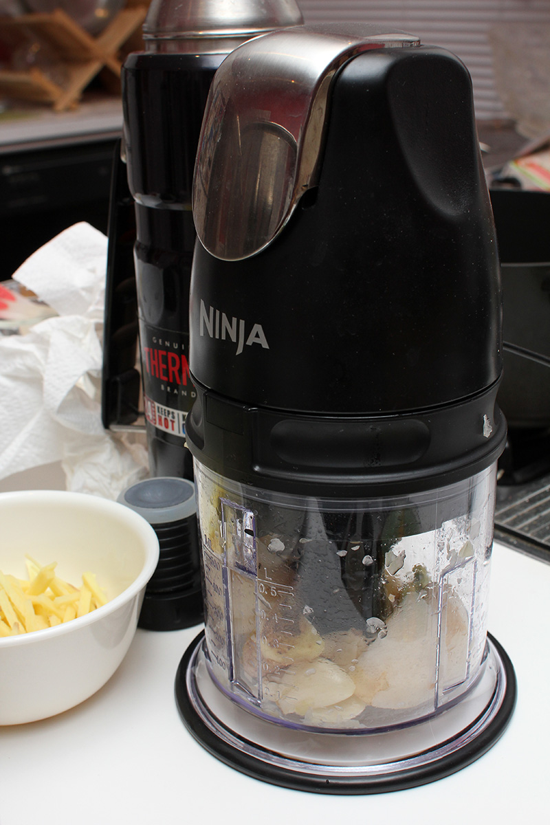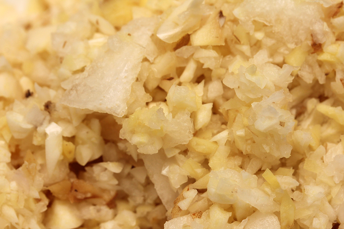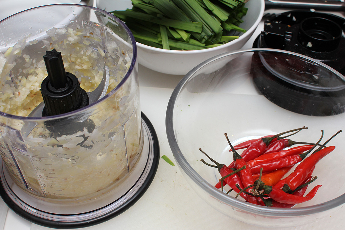 0.20 lbs. ginger, processed 2 heads of garlic, processed 1 asian pear, processed 15 thai hot peppers, chopped 0.36 lbs. garlic chives, chopped |