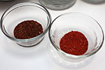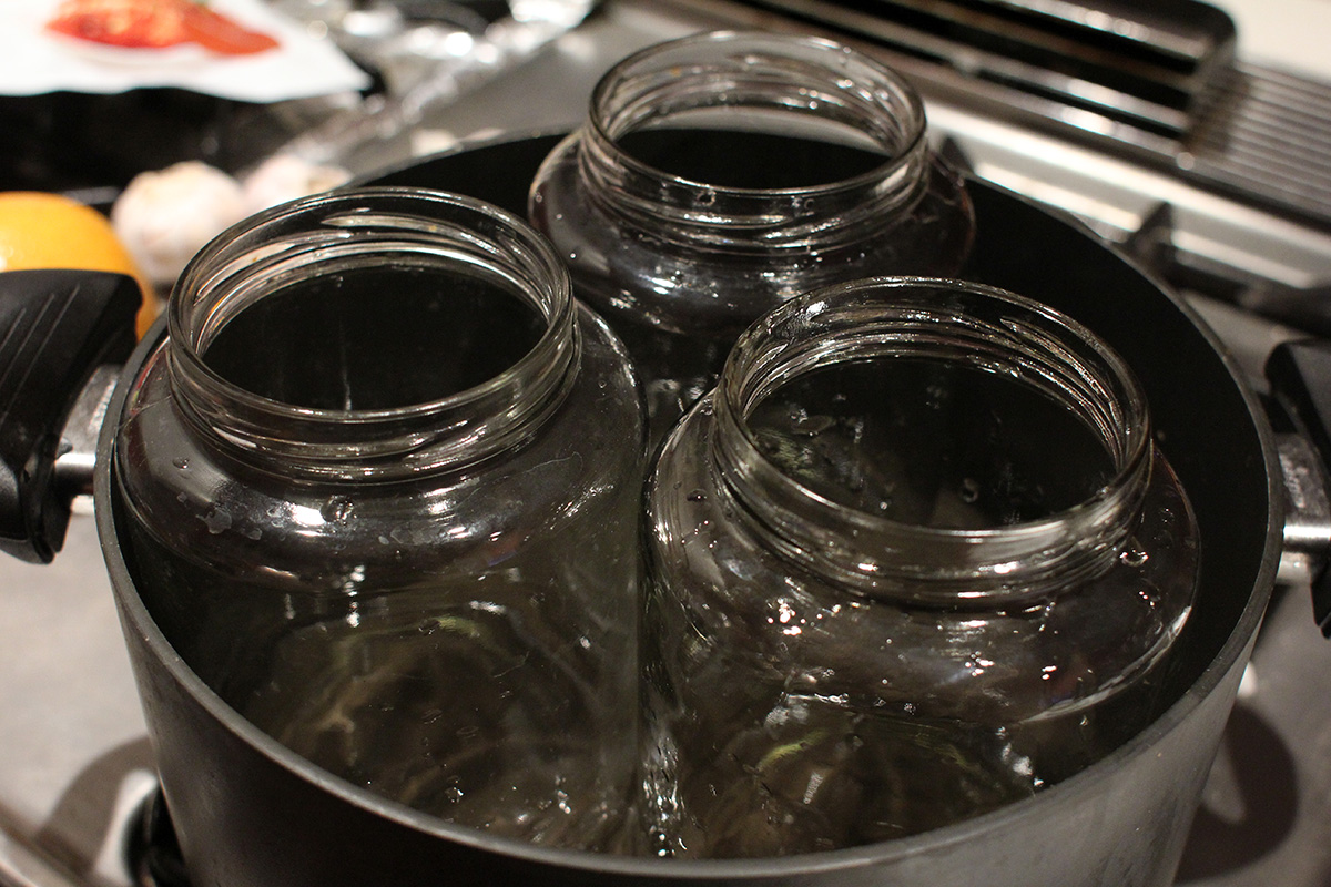 the cabbage had a chance to reduce for 2 hours, but normally i reduce to 6 hours before mixing in the other ingredients and packing the kimchi into jars. in the meantime, i soaked some jars in boiling water. probably not the best way to sanitize the jars, but easier than running them through the dishwasher which takes forever. i compared the old korean pepper powder to the new one i got. while the expired powder was dark maroon, the new powder was bright red. the lesson learned here is always use fresh chili powder!