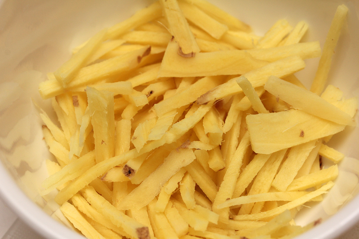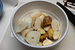 i prepared the additional ingredients to be mixed with the cabbage. i cut the bundle of garlic chives into quarters. i peeled the ginger and asian pear, cutting them into smaller sizes so they'll fit in my small food processor. i had more ginger than i needed so i saved half (the portion amount in the recipe list is already 1/2 the amount). of the ginger half i didn't save, i julienned half of that into thin slices. i also peeled 2 heads of garlic (about 20 cloves). into the food processor went the 3 ingredients.