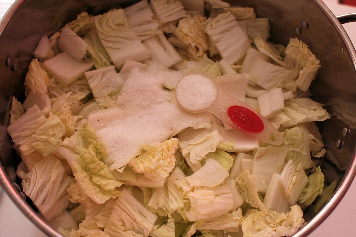i salted and mixed the chopped cabbage and daikon radish. i found the amount of salt i used last time was a bit too much, but my parents thought the flavor was just right, so i kept the portion to 5 tbsp of salt. i used fine sea salt because i had a whole carton cristina left behind (she broke the rotating cap so now it won't close properly), but any salt is fine. for fermenting vegetables, i prefer fine salt with no additional additives (like iodine, but it's not a big deal).
