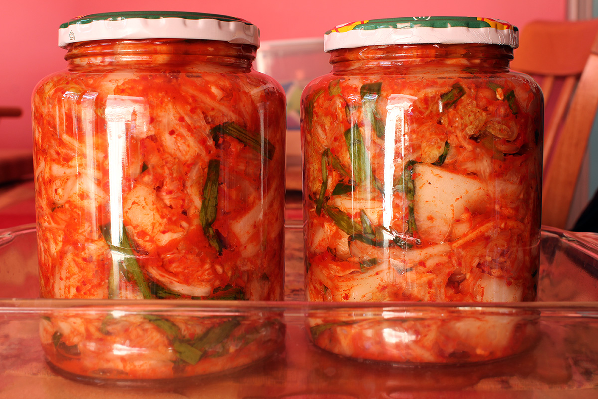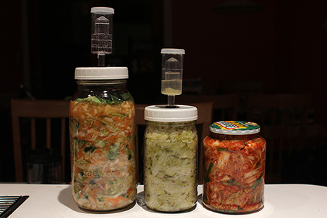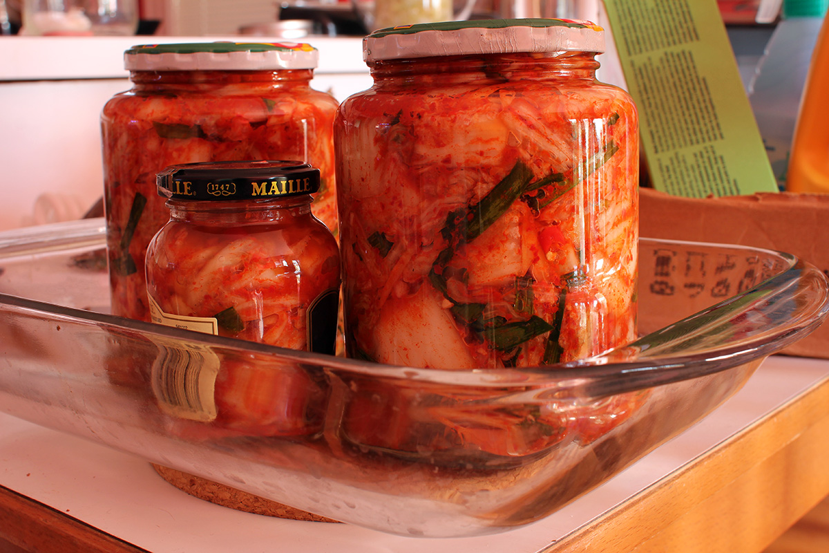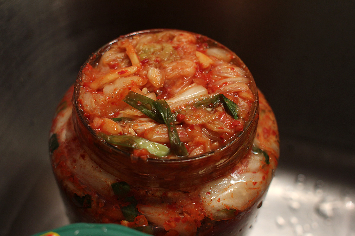 it's day 3 of my kimchi ferment, and like clockwork, they're ready to go in the refrigerator. the whole time i was making curtido in my kitchen, i'd occasionally hear these soft hissing sounds coming from the kimchi jars. i burped them slowly, revealing a densely packed container of bubbling kimchi. they were so full i had to remove a little bit from each jar and put it in a smaller pint jar just to keep them from leaking anymore.