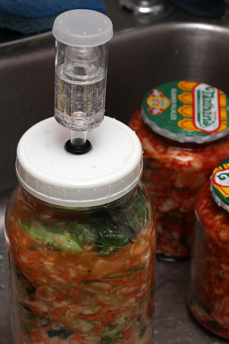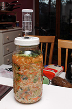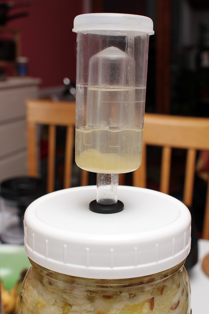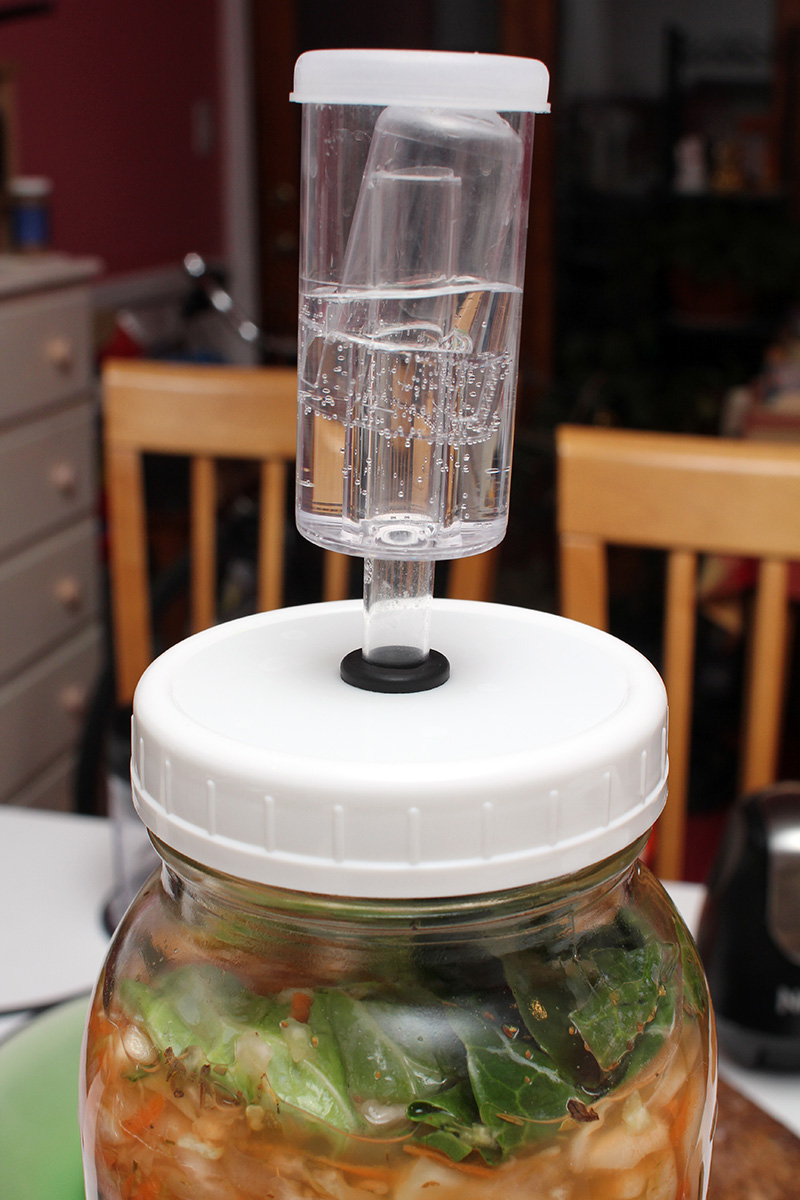 i packed the curtido at 4pm, and by 9pm the airlock was already filled with carbon dioxide. the airlock on the sauerkraut jar, not so much, although i have seen it rise it fall in the past few days. there is still fermentation going on inside the sauerkraut jar (it's only day 10, i'm only halfway through my 3 week ferment for this 3rd jar).
