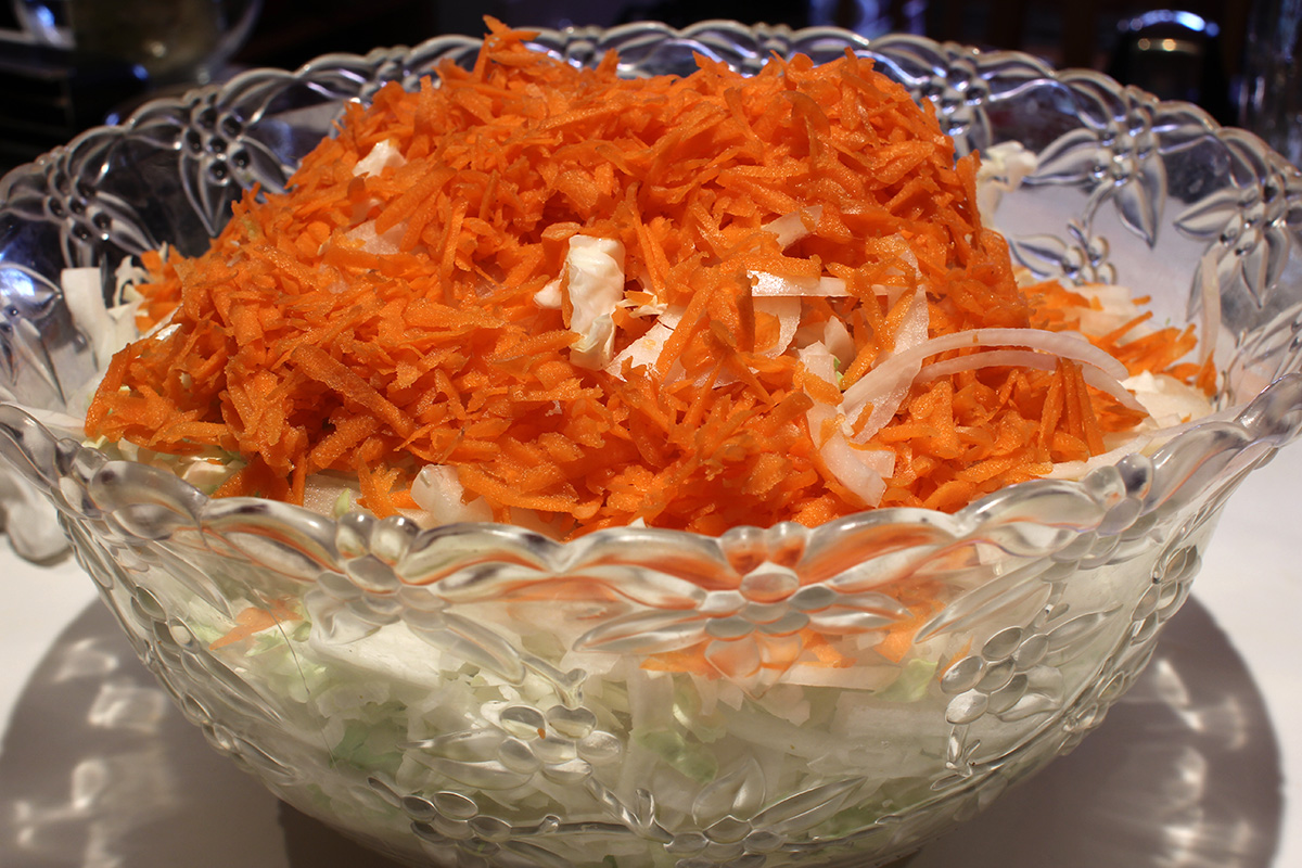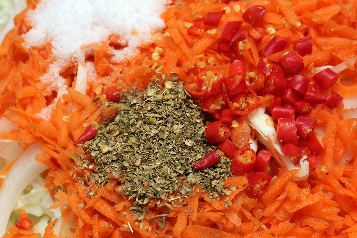 2.9 lbs. green cabbage 0.56 lbs. carrots, grated 0.67 lbs. onion, chopped 5 garlic cloves, chopped |