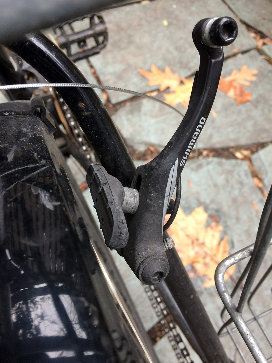 replacing the pads should've been easy, but it took me a long time because i discovered i needed to increase the distance between the pads and the tire rim. i ended up rearranging the order of the concave washers, so that the thin ones were inside while the thick ones were outside. i also used the old washers, they seem a better quality than the ones that came with the new pads. once the properly distanced pads were installed, it was an easy matter of tightening the brake cable. finally i oiled the chain, and anywhere else that looked rusty.