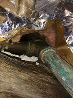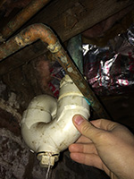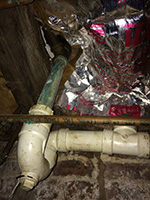 finally, i got my father to help me use the motorized drain snake. it wasn't just my imagination, there seems to be something stuck in the drain, probably a segment of the drain plunger, and the snake couldn't get down more than 4-6". we went in the basement to check out the plumbing; the pipes are easily accessible, but will probably require a professional plumber to do the job. a segment of pipe could also use some replacing, as it seems heavily corroded with green patina.
