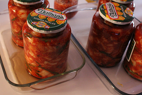 i also gave him all 5 jars of kimchi, which are ready to eat after 3 days of fermenting (they were overflowing the jars this morning). i tried a few pieces earlier, not especially salty, sweeter than before (courtesy of 2 asian pears), spicier too, just a complexity of flavors, maybe the best kimchi yet, better than the batch i made 2 weeks ago.