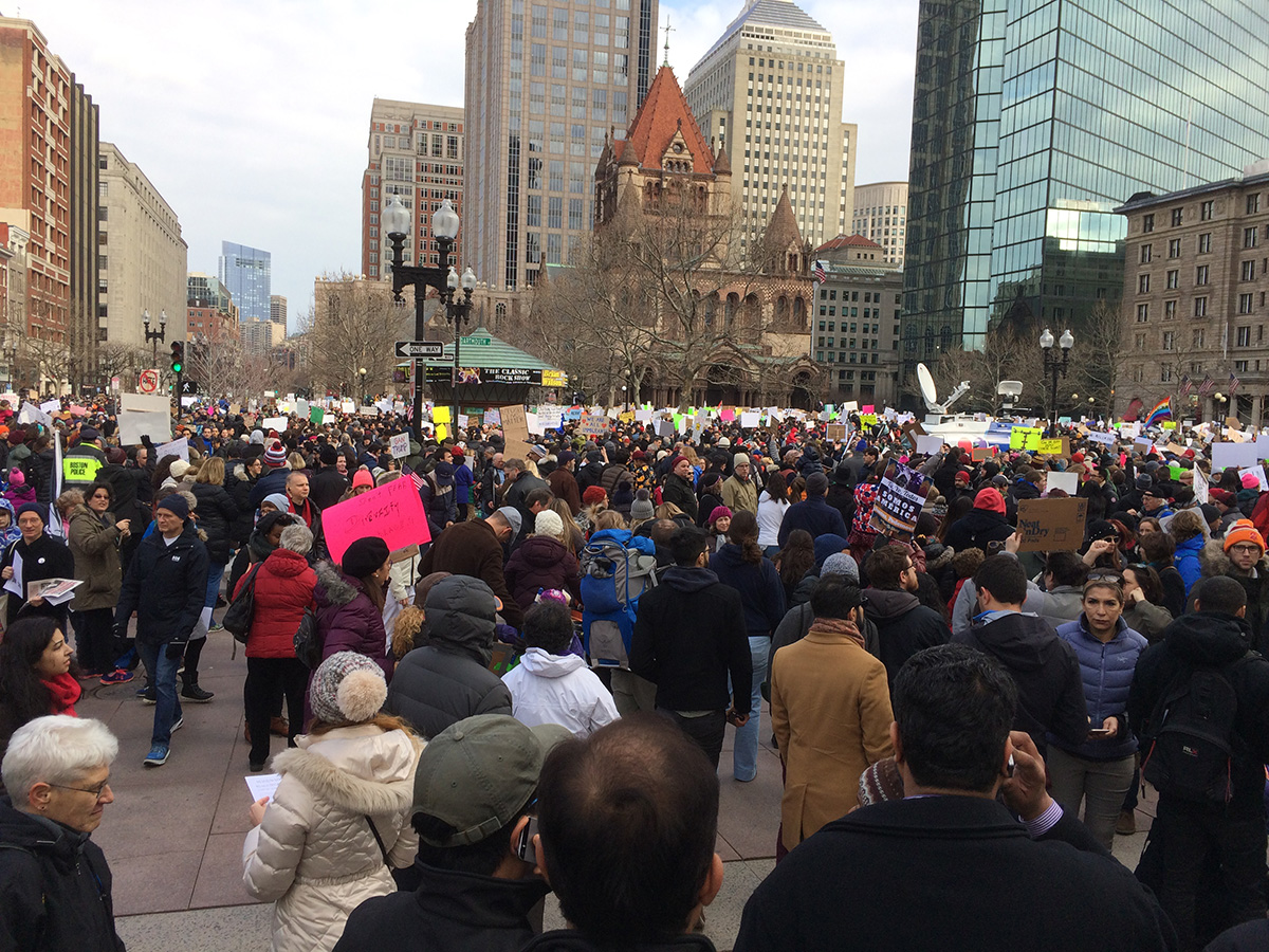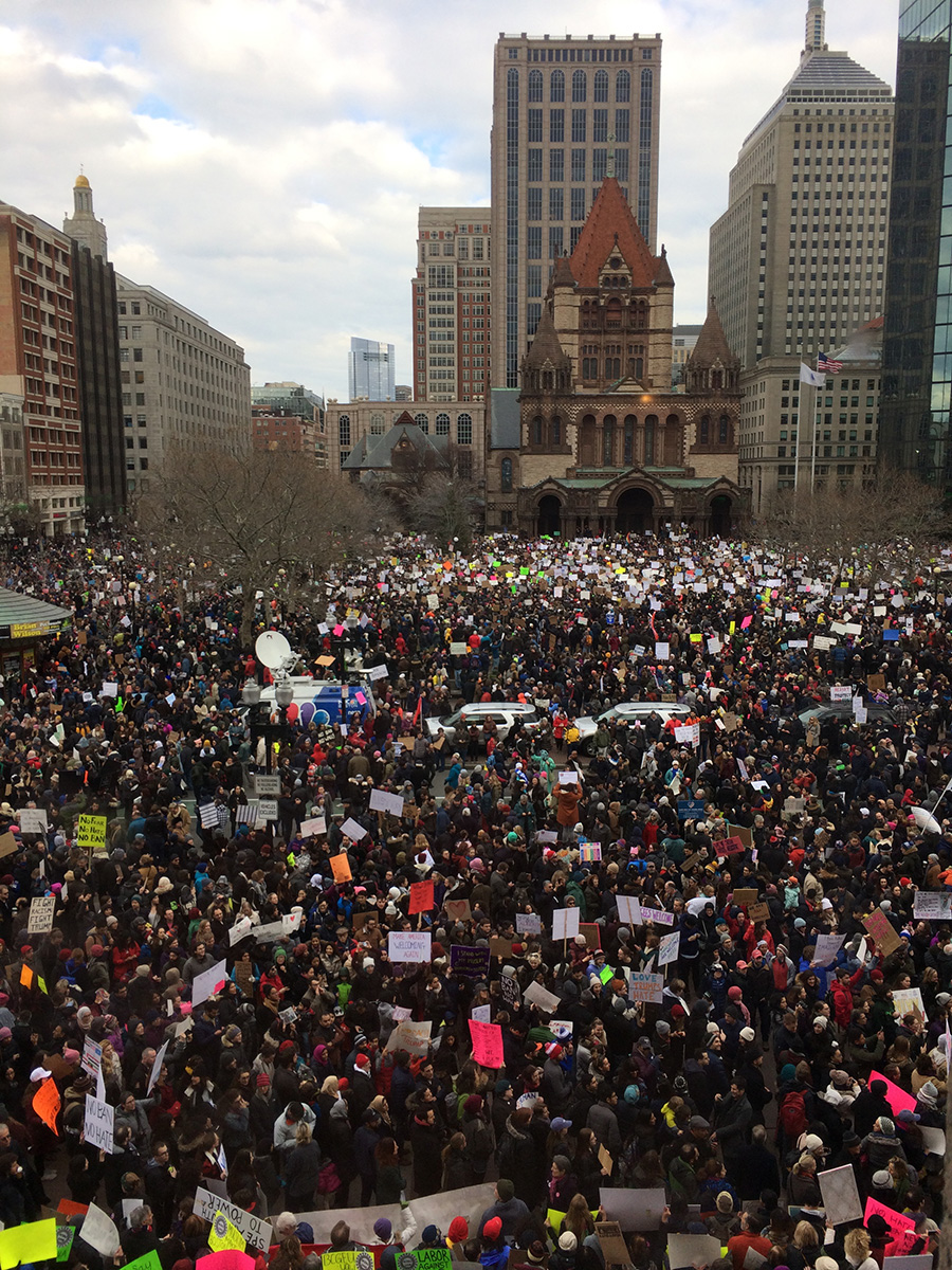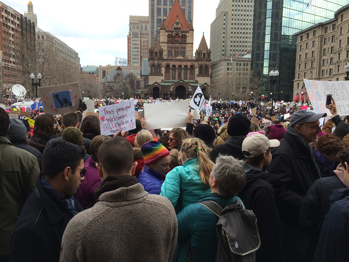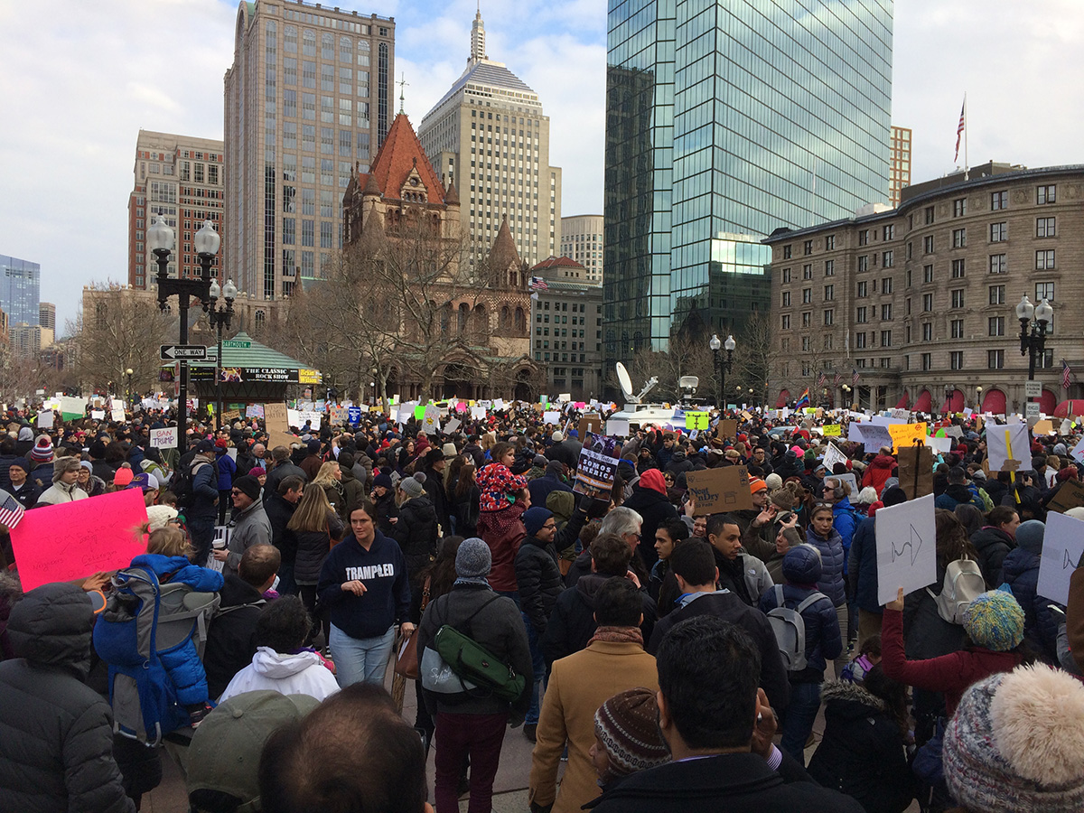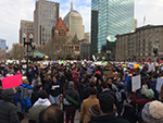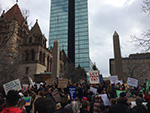 after we finished eating, we cut across boston common then the public garden to commonwealth avenue. we then headed to copley square. by then it was already close to 2pm, but the 1pm muslim ban protest only seemed to be getting started as streams of people (some carrying signs) crowded streets and sidewalks all going the direction of copley square. karen said it was inspirational to see so many people protesting the actions of presidential trump. she took photos and stopped to send them to her parents.