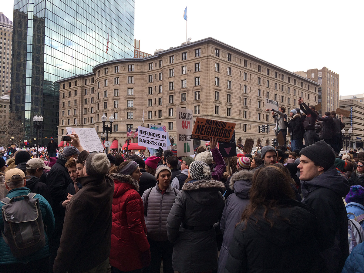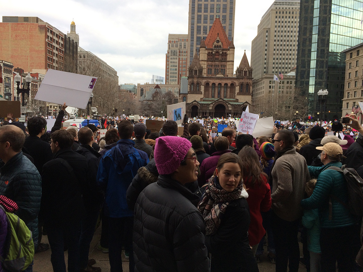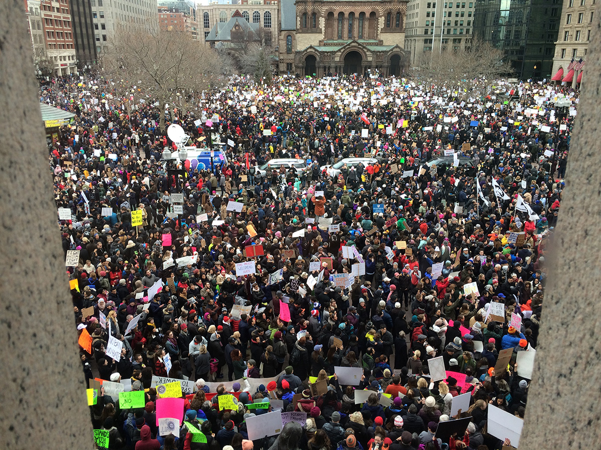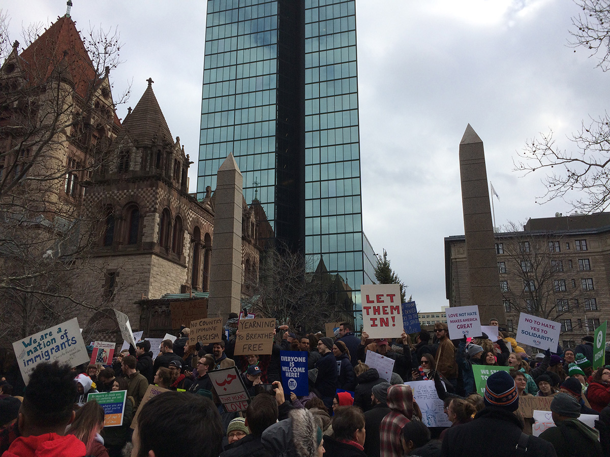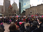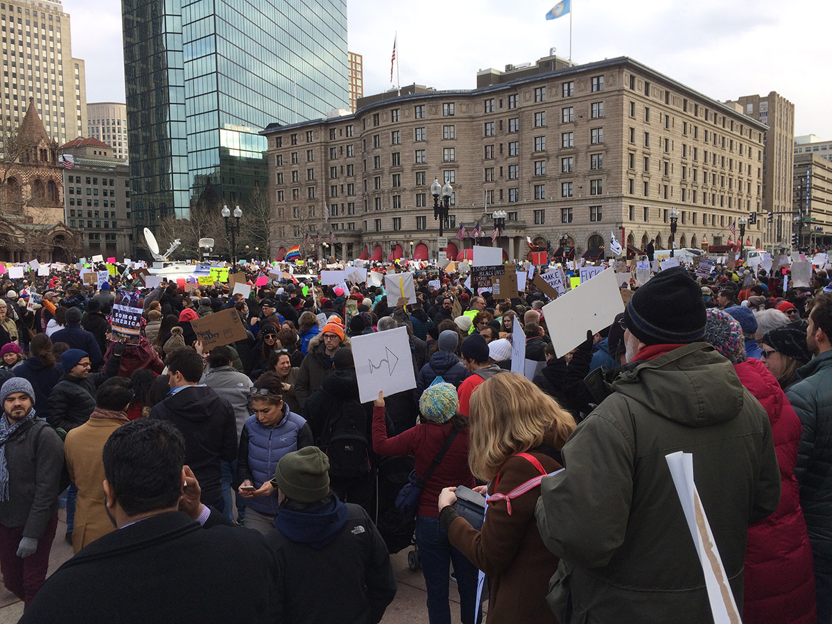 after we finished eating, we cut across boston common then the public garden to commonwealth avenue. we then headed to copley square. by then it was already close to 2pm, but the 1pm muslim ban protest only seemed to be getting started as streams of people (some carrying signs) crowded streets and sidewalks all going the direction of copley square. karen said it was inspirational to see so many people protesting the actions of presidential trump. she took photos and stopped to send them to her parents.