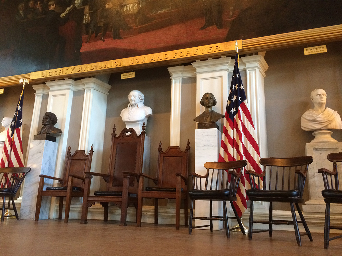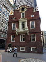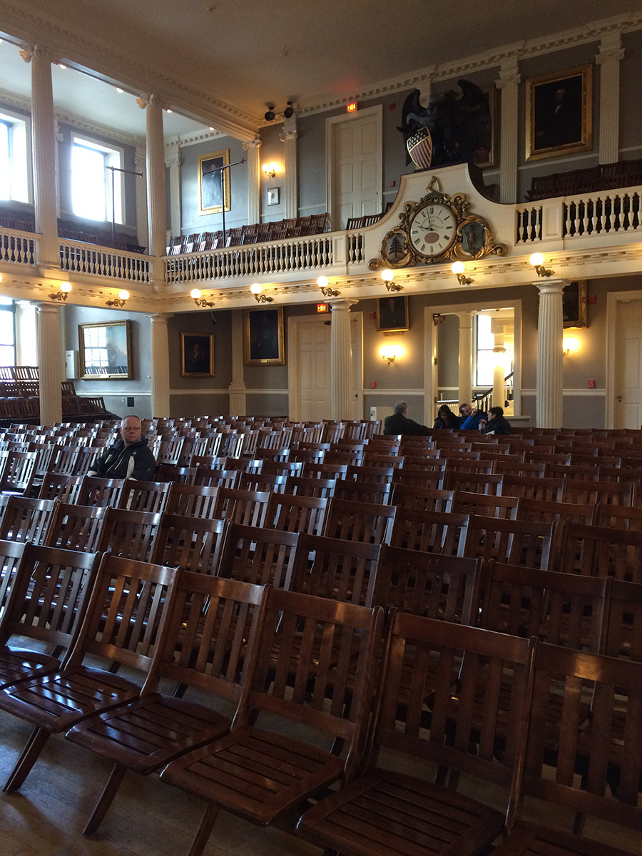 we arrived at faneuil hall around 11:30am, which gave us a chance to use the bathroom. i've always wanted to see the actual meeting house. i did see it one time for myself, back when my father became a naturalized citizen and he had his ceremony here. but i couldn't remember how i got inside, and every time i've been back i could never find a visible entrance, so i just assumed it's only opened for special occasions. but emboldened on this occasion, i decided to ride the small elevator to the 2nd floor. and viola! the actual faneuil hall meeting place. as a joke, i kept referring to it as the "cradle of liberty" after karen saw a sign downstairs and asked me the definition of cradle. "a cage for a baby," i answered.