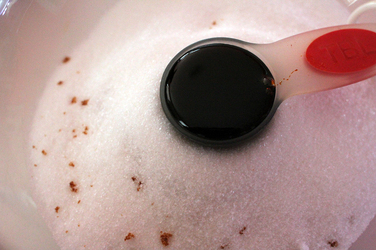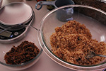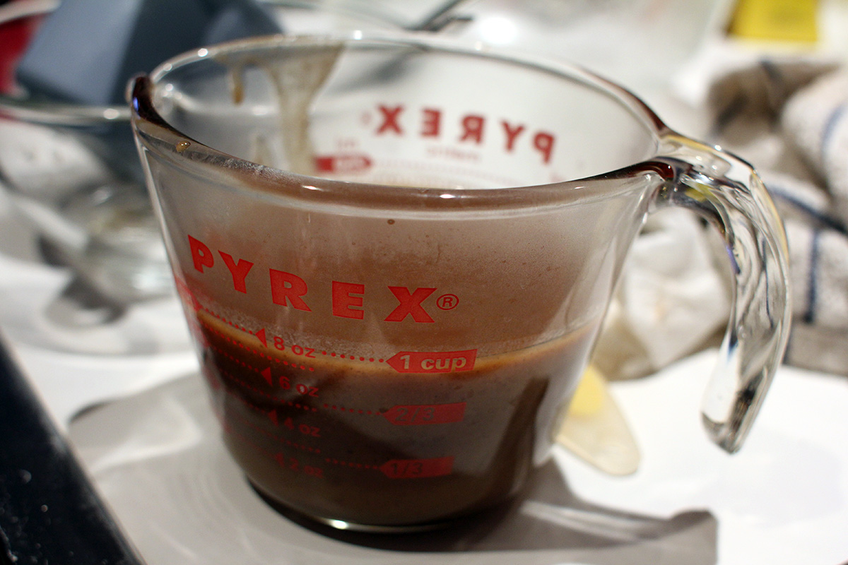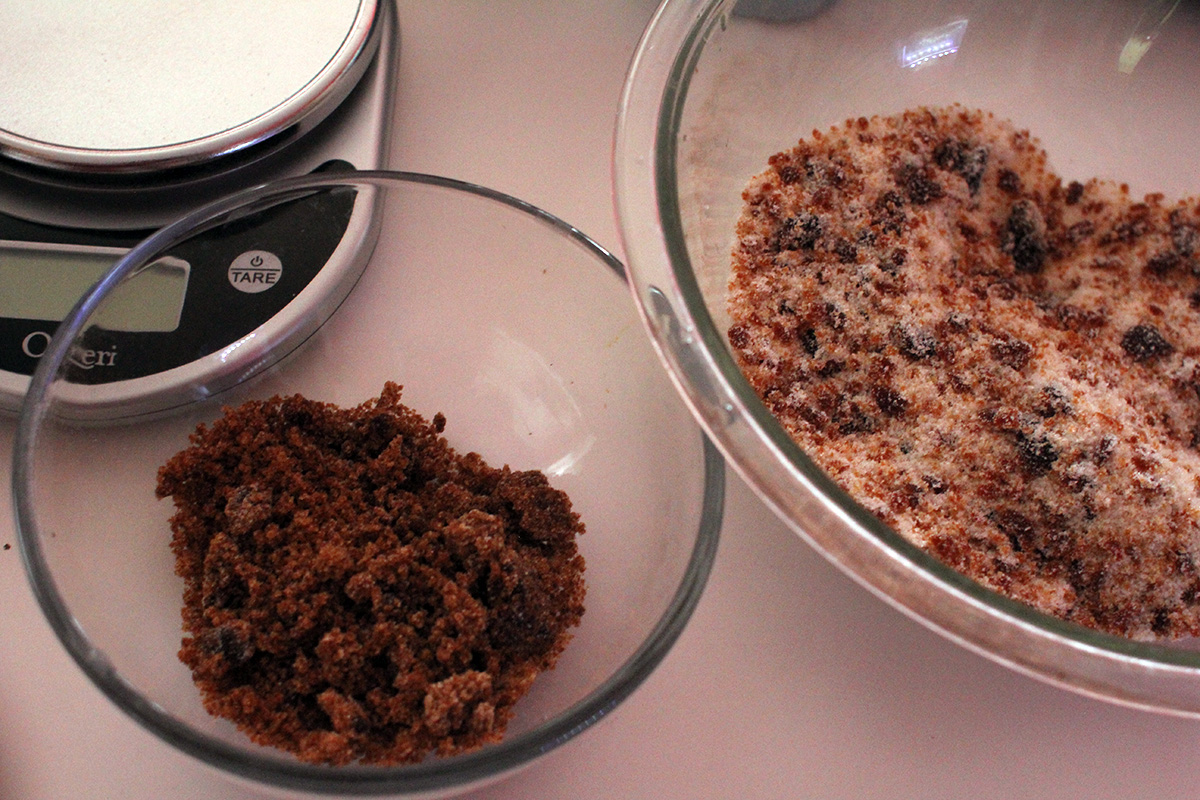 the recipe asked for more than 2 lbs. of brown sugar in half dark/half life portions, but i found that was simply too much. earlier i weighed a cup of sugar and it comes out to about 1/2 lbs. per cup. so i decided to use only 1 lbs. of brown sugar, or 2 cups worth.