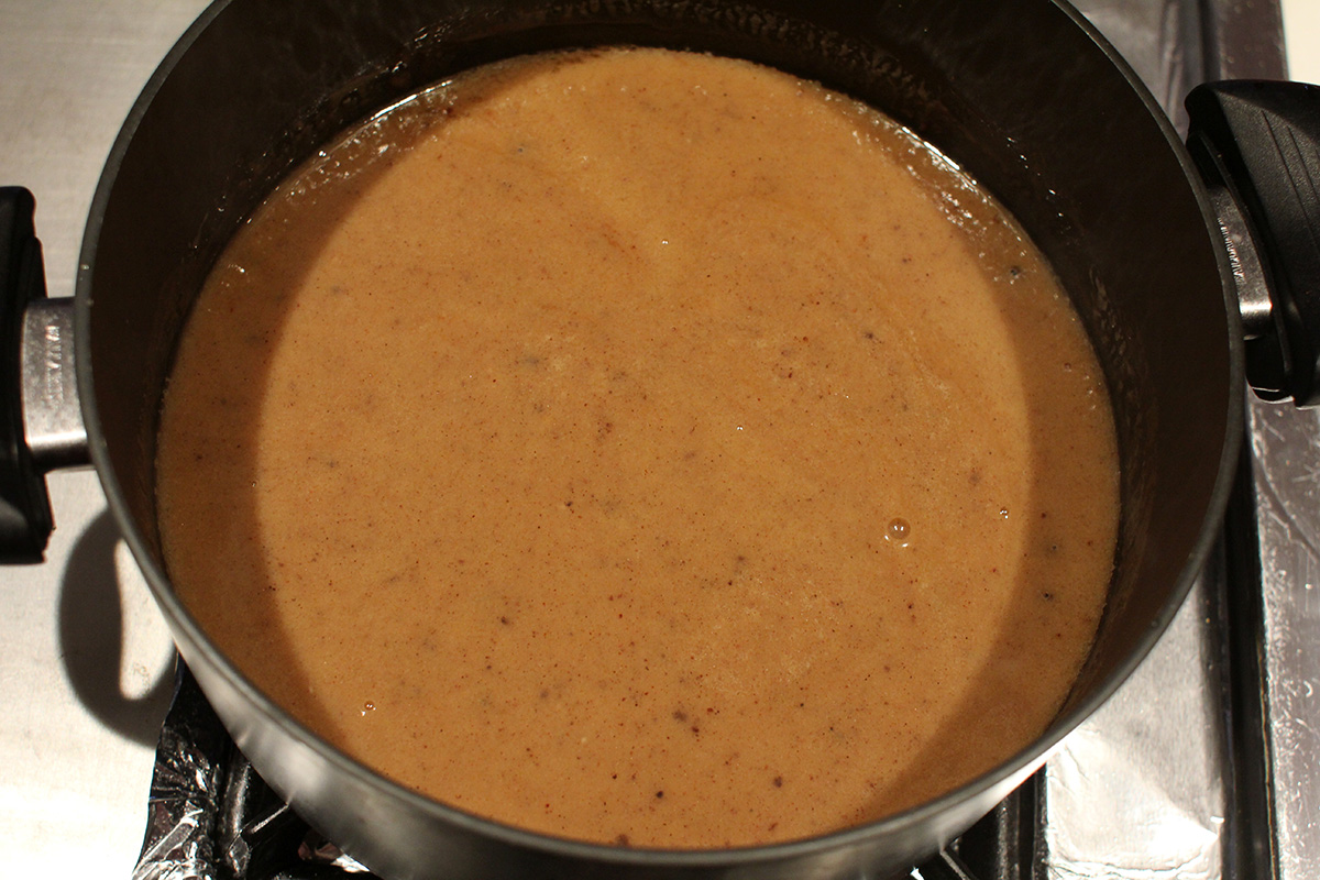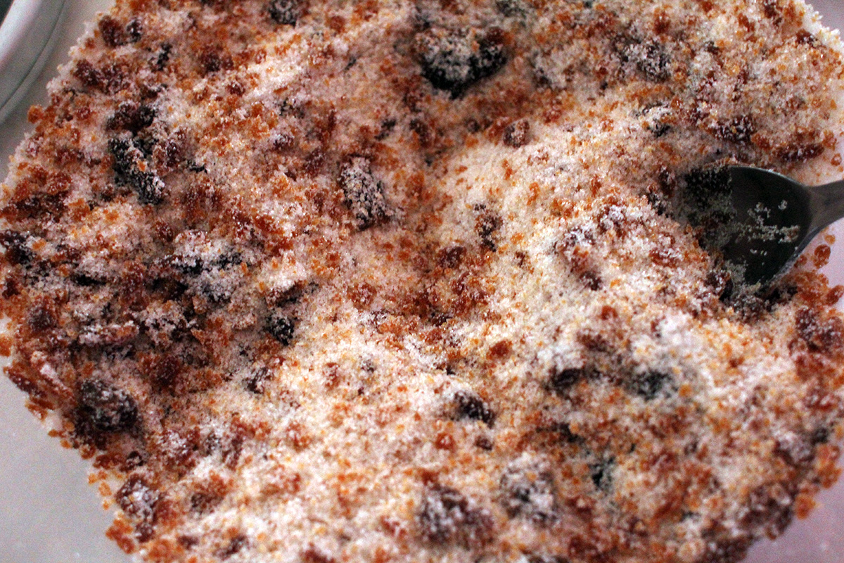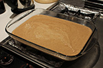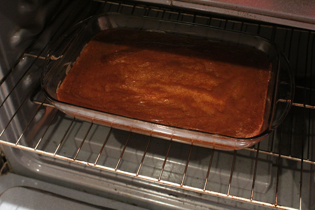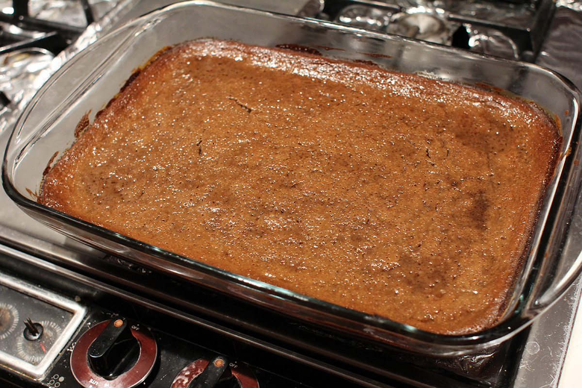 next i prepared the liquid portion of the recipe. i melted a whole stick of salted butter before adding 2 cans of coconut milk, 2 cups of brown sugar, and all the spices. i cooked everything for about 20 minutes. to the cassava i had 1/4 cup of water combined with 1 tbsp of corn starch to make a slurry. not sure if this was entirely necessary as the cassava already has plenty of starch for thickening. after the liquid finished cooking, i saved 1 cup for basting then combined the rest with the cassava. into a butter-greased lasagna tray i poured in the mixture, and into the oven it went for 45 minutes baking at 400°F.