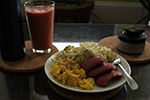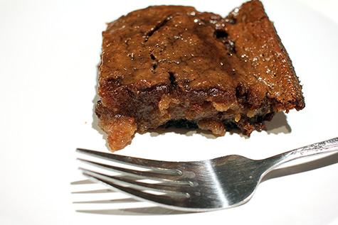 after letting the cake cool for a bit, i cut out a slice. the edges were particularly crusty, so crusty in fact it was almost impossible to cut. as for the taste? i was somehow expecting it to taste like the other tapioca food i know, those tapioca balls in bubble ice tea. but a cassava heavy cake tastes a lot like pumpkin pie. the texture comes from the cassava, but the taste comes from the coconut milk and brown sugar, and definitely the blend of spices. i also served a piece to karen. she seemed to like it, although maybe she was just being nice.