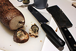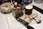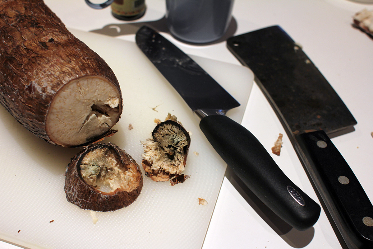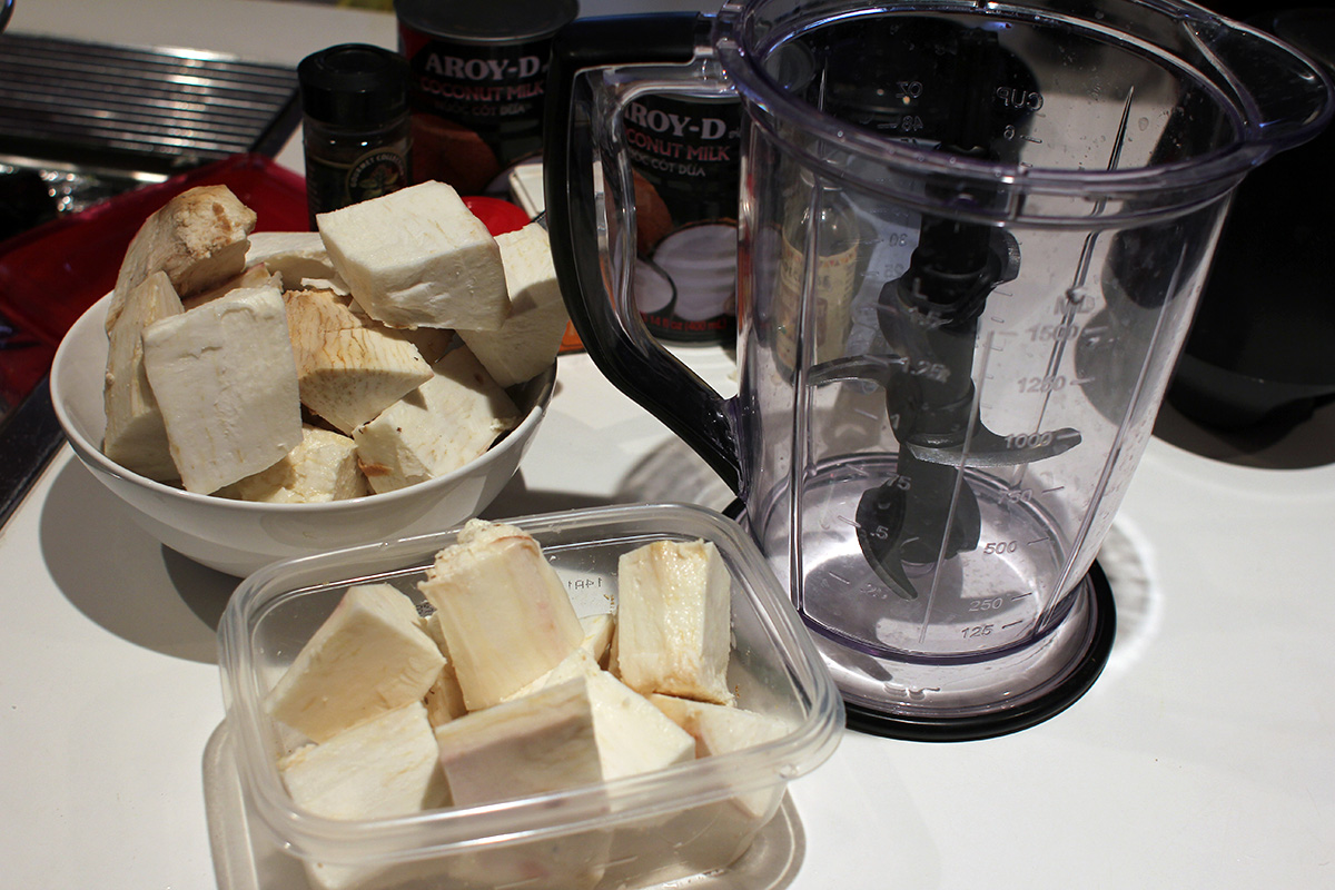 next came the cassava. it seemed so hard that i couldn't imagine easily cutting through it. instructions said to remove the ends first, and that was pretty difficult. it was easy on the soft end, but when i looked inside, there was a small area that had gone moldy and rotted. the weird thing was, it didn't smell bad, and i was actually tempted to taste it. it had an aroma of sweet fermented glutinous rice. the other end was harder to remove, and i even used a meat cleaver. fortunately the middle part of the cassava was easier to cut, as i divided the tuber into 3 segments. i then trimmed off the skin with the knife, and cut the cassava into smaller cubes so they'll fit in the processor.