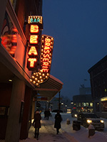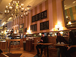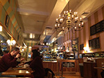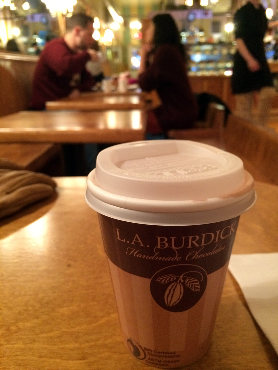 when we finally arrived at l.a. burdick we thought it was closed but a sign outside informed us they were indeed open for business (though closing early at 7pm). it was still fully staffed, about half a dozen young employees. their boss really must not care too much about their safety on such a treacherous travel day, or the boss figured busy would be good on such a snowy and cold day. it was actually somewhat crowded, with no available tables, so we ordered our hot chocolates to go, but not before a few tables opened up, encouraging us to stay instead. karen got the dark hot chocolate, i got the milk hot chocolate. at $5 for a small it was pretty decadent but the perfect drink for the early february blizzard of 2017. i'd never been to l.a. burdick before, it's a nice little cozy place. if i ever have visitors during the winter and it snows, i'll be sure to bring them here for hot chocolate.