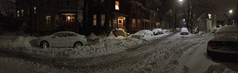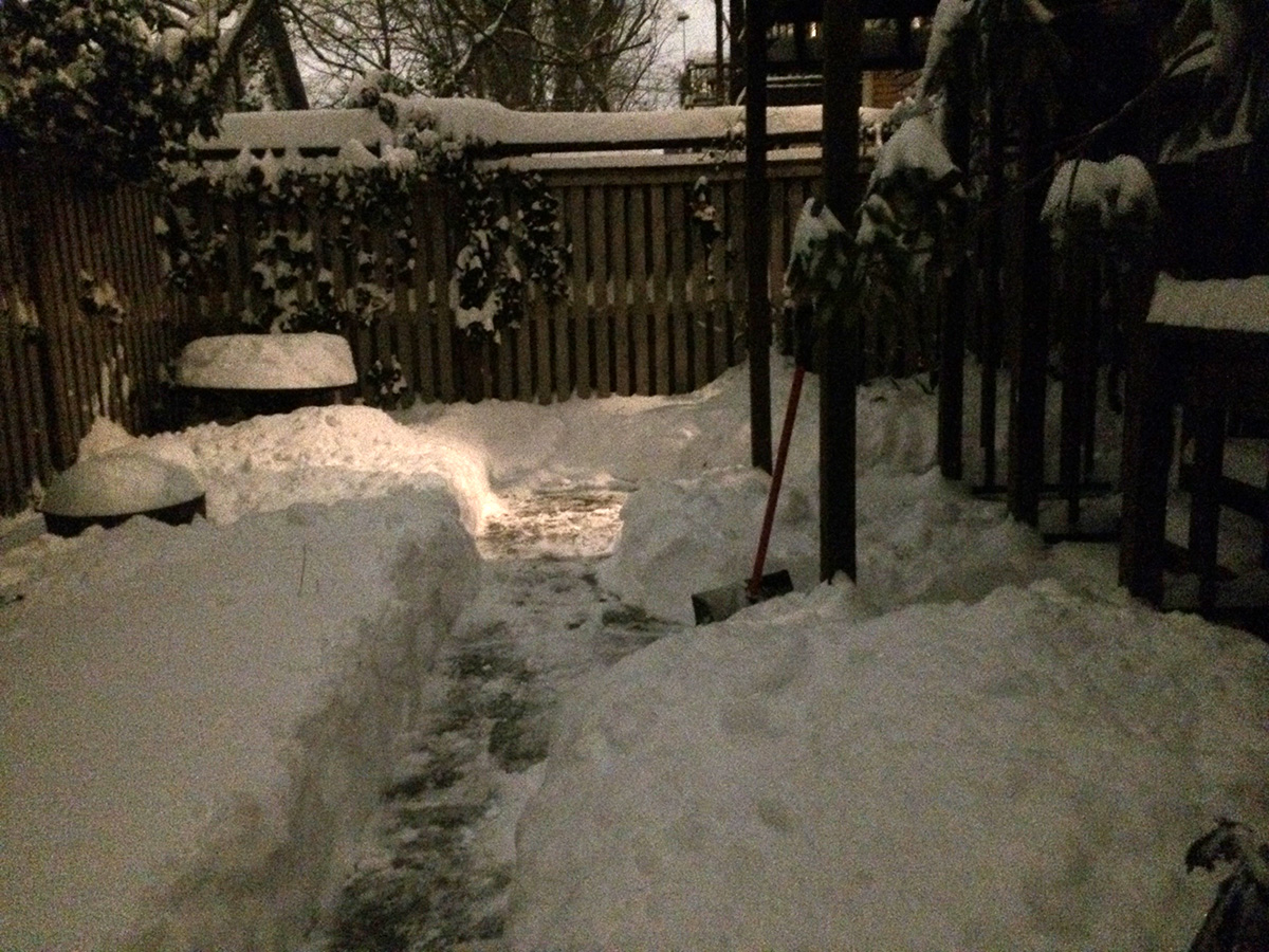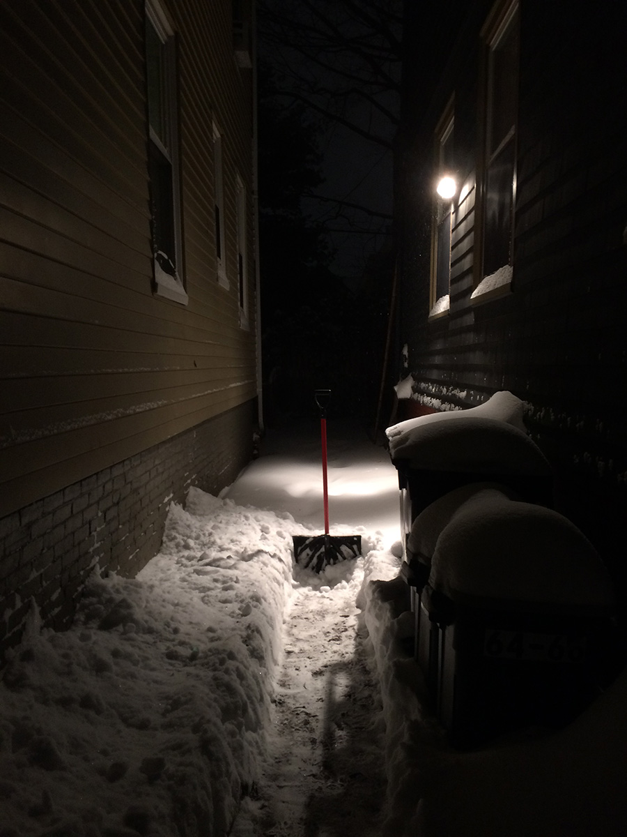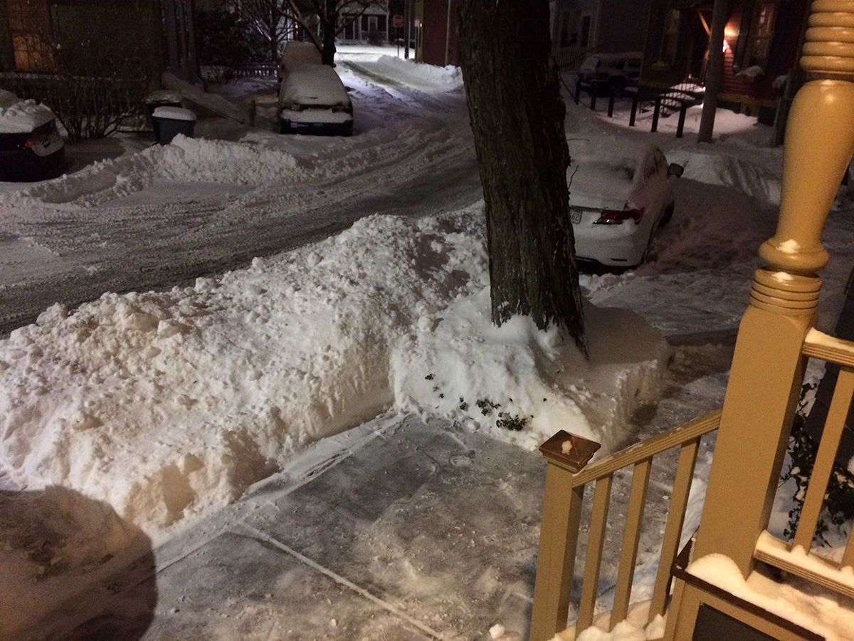 around 7:30pm i went back outside to shovel the sidewalk for the last time, since the blizzard was already dying down. not only did i clean the sidewalk, but i also cleared out two paths out to the street. i didn't know what to do with all the snow so i just piled it onto the empty parking spot directly in front of the house. that spot was sacrificed already since nobody had parked there and it just filled up with snow.