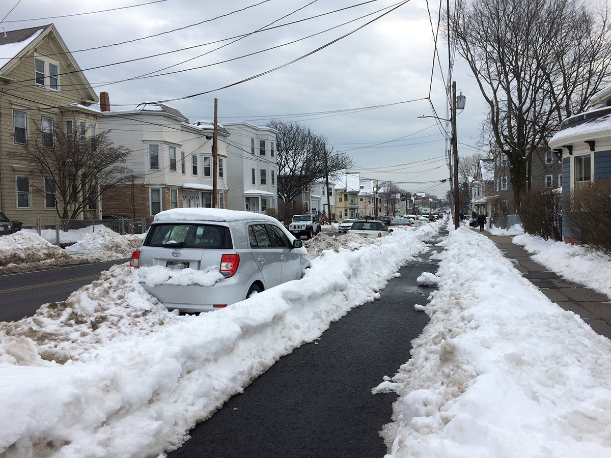the walk from my house to the subway station was uneventful. i was surprised the city of somerville plowed the fancy new cycle track on beacon street, but falling snow from the high snow banks lining either side of the track meant there was still plenty of icy obstacles. i saw someone actually biking on the track, but also someone just biking out on the street; so much for a dedicated bike lane. i kind of hate the cycle track: i think it's an eyesore, difficult to use, and i wish things could go back to the way it was before. beacon street is just a mess right now, made worse by all the snow, something the city planners failed to take into consideration. one more thing: the cycle track is only on one side of the road (inbound), which means on the way back bikers are forced to ride in the street, with just a sliver of bike lane since the roads are much narrower courtesy of the cycle track (outbound bike lane are currently nonexistent due to all the snow).