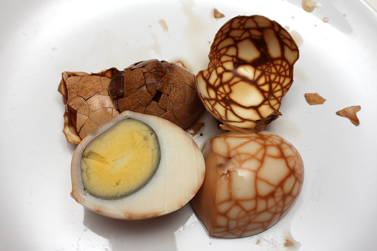i tried one of the tea eggs. even after just a single night of soaking, this tea egg was better than the ones i made back in january. the egg was easier to peel, marbling on the egg white was more pronounced, and the flavor was perfect. in fact, i think they're ready to eat now, no need for additional soaking, although i did divide up the eggs into plastic quart containers and filled them with brine. i forgot to add a tsp of sugar to the brine, but i think the flavor is fine as is.