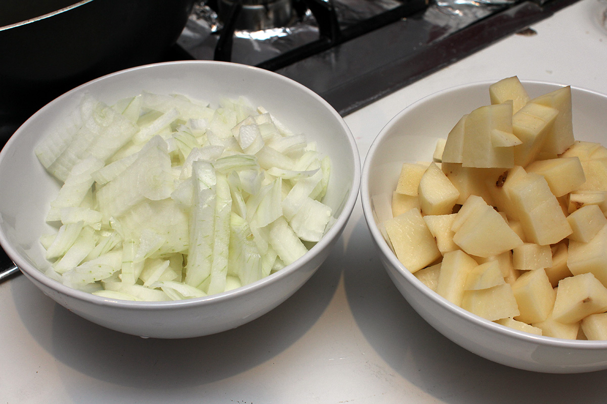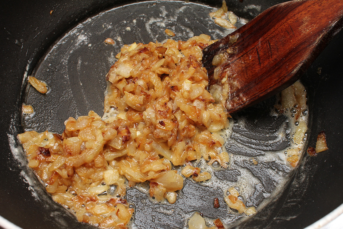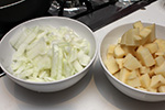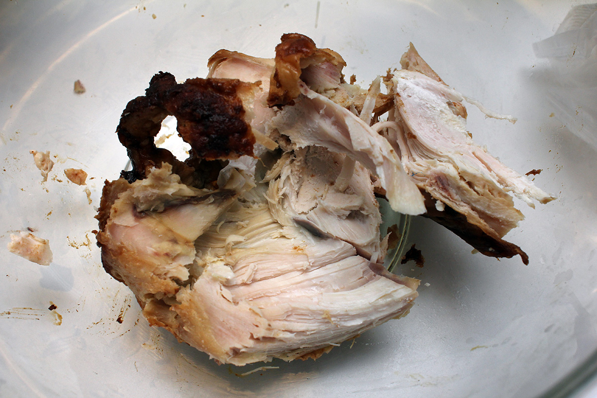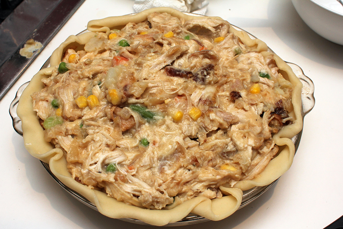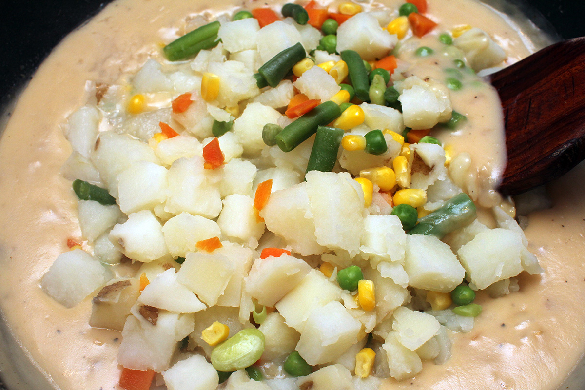 1 lb. rotisserie chicken, shredded 2 tbsp butter 1 yellow onion, caramelized 1 cup frozen mixed vegetables 1 russet potato, skinned, cubed |