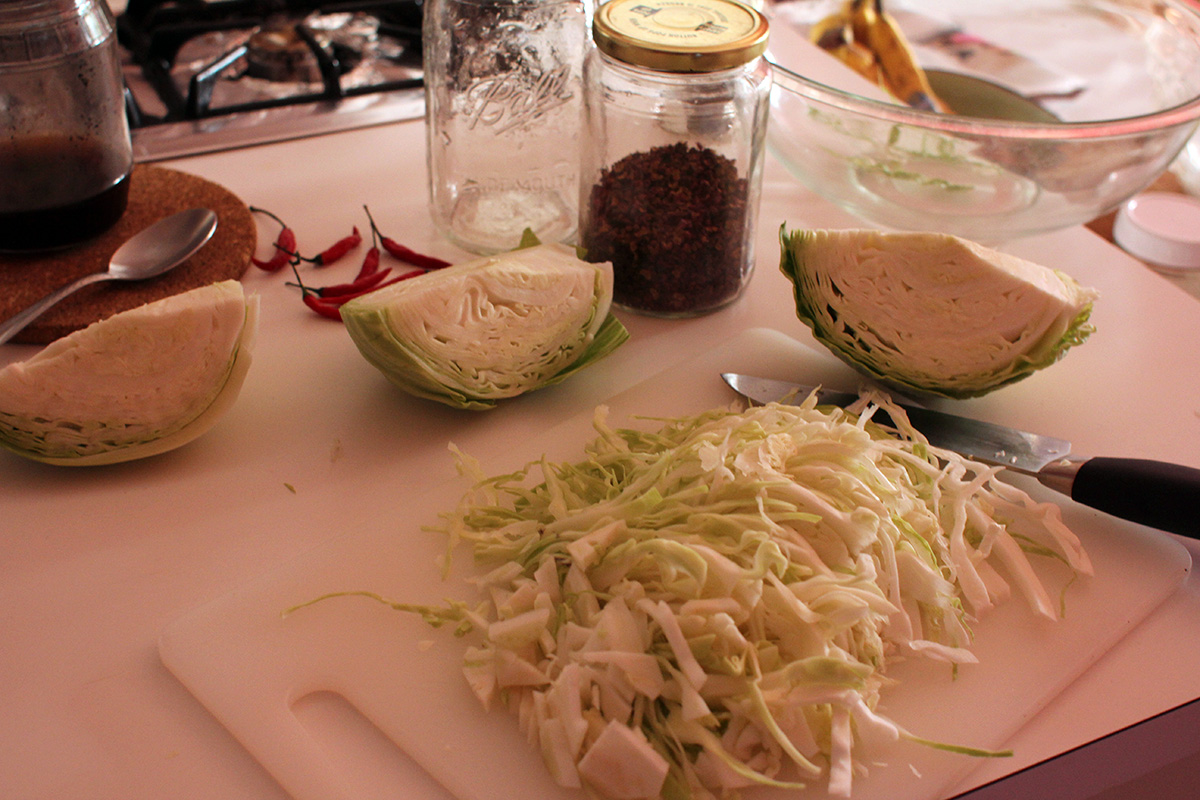 i finally used up that head of cabbage that'd been sitting on my kitchen counter for over a week. i noticed the outer leaves was starting to get a little old, and if i waited any longer the cabbage would go bad.