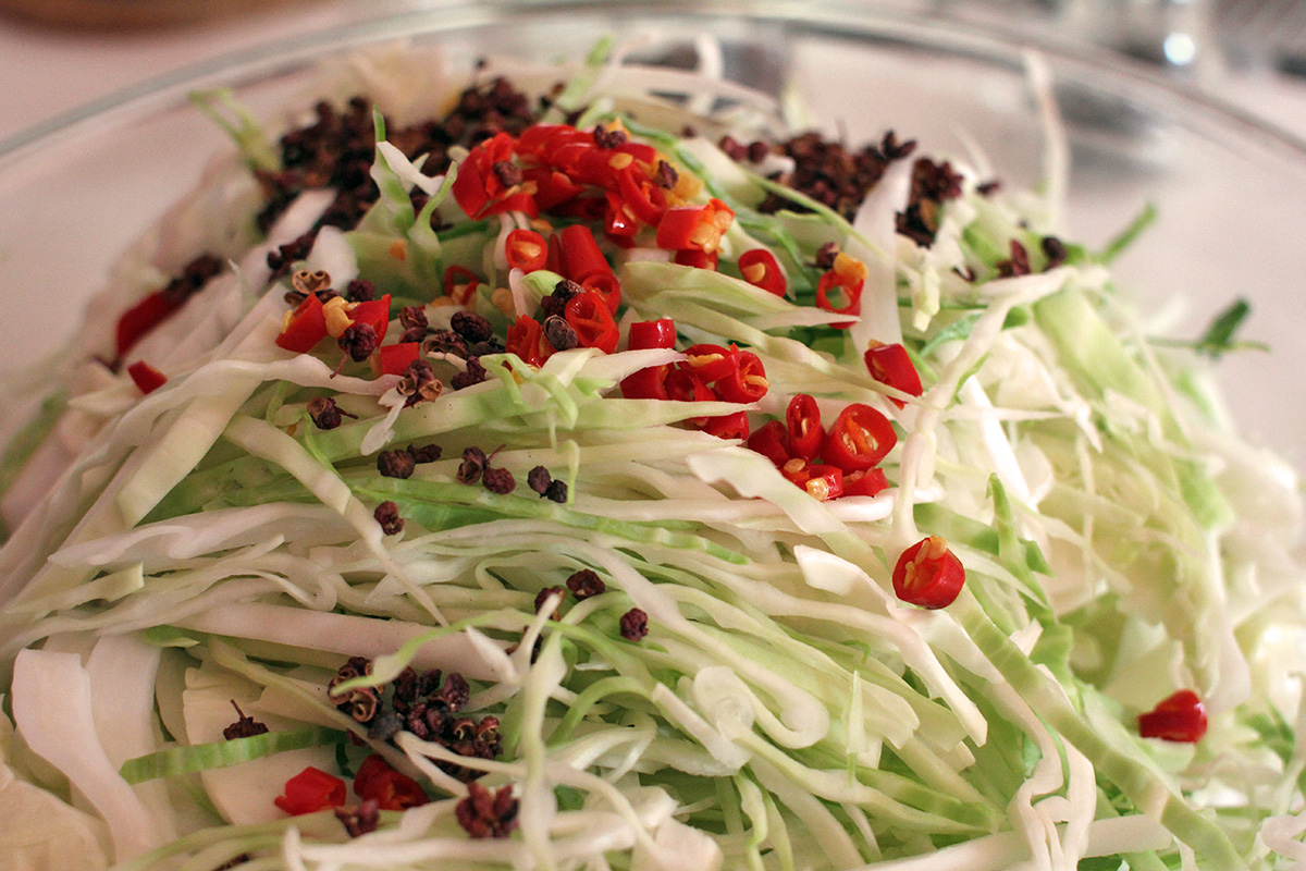 1 cabbage (2.6 lb.), shredded 5-6 thai chili peppers, chopped 3-4 tbsp red sichuan peppercorn |