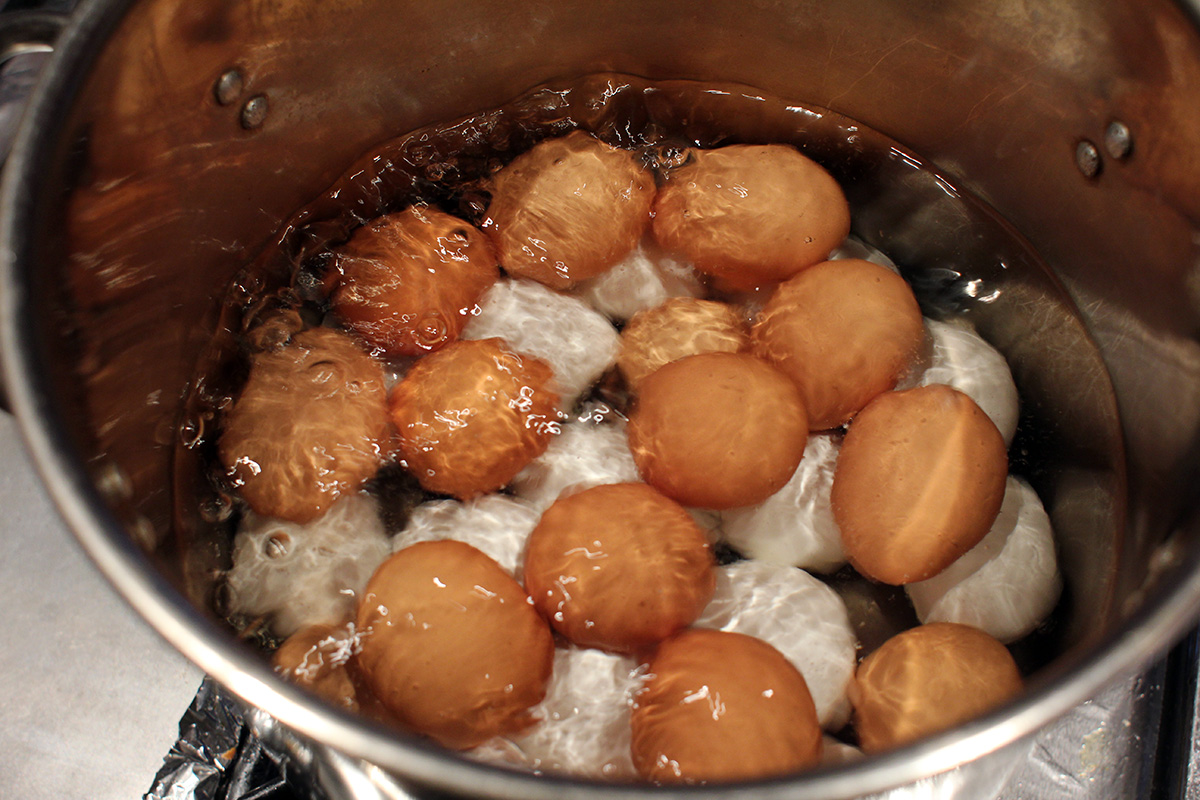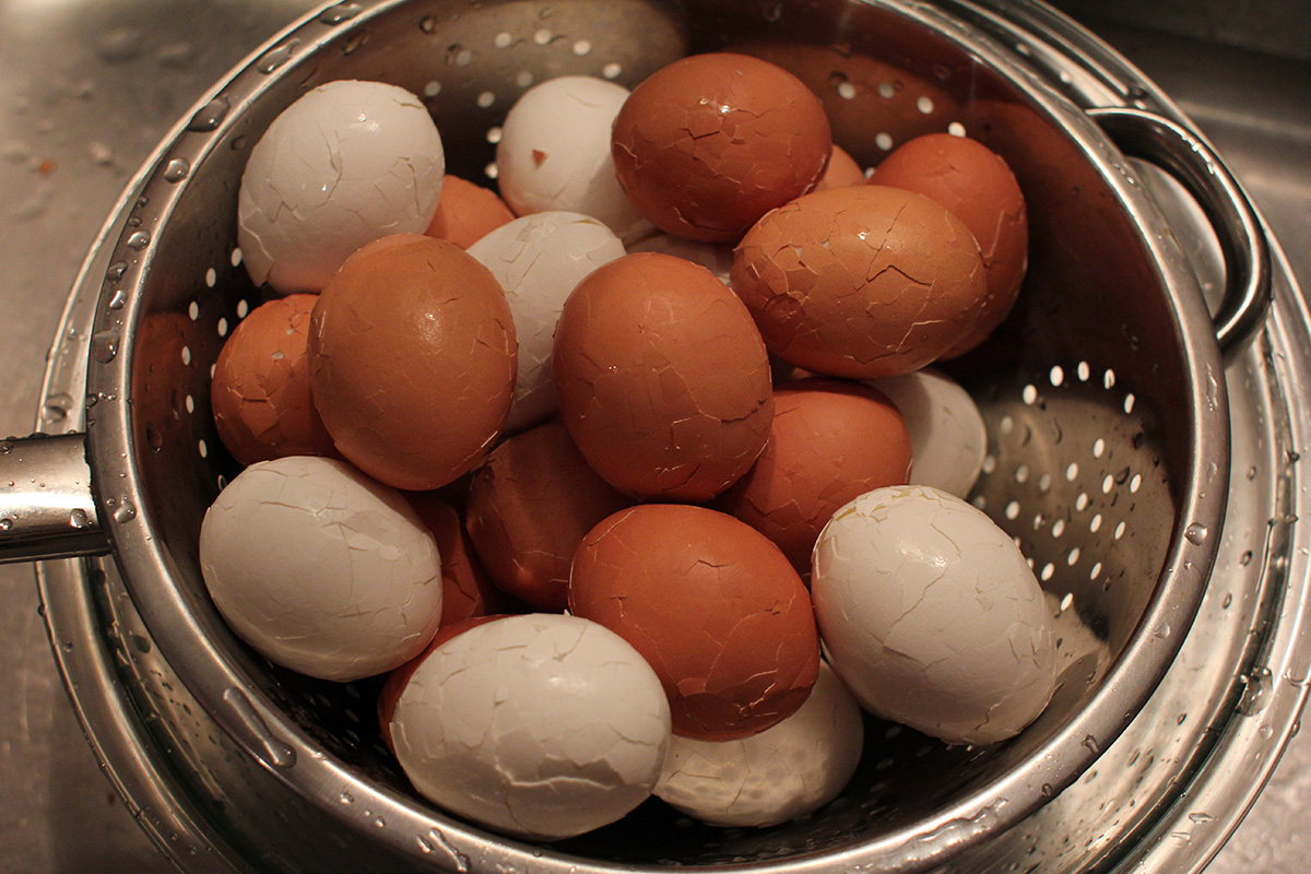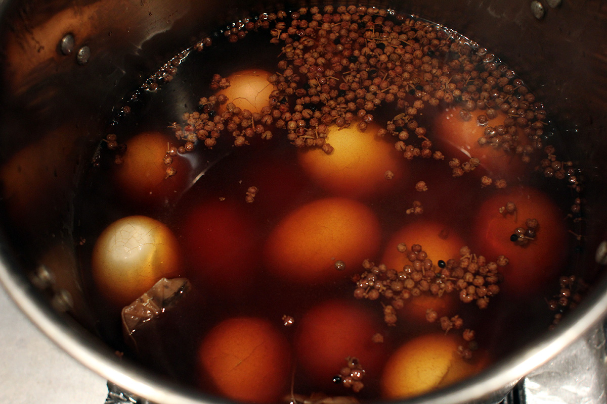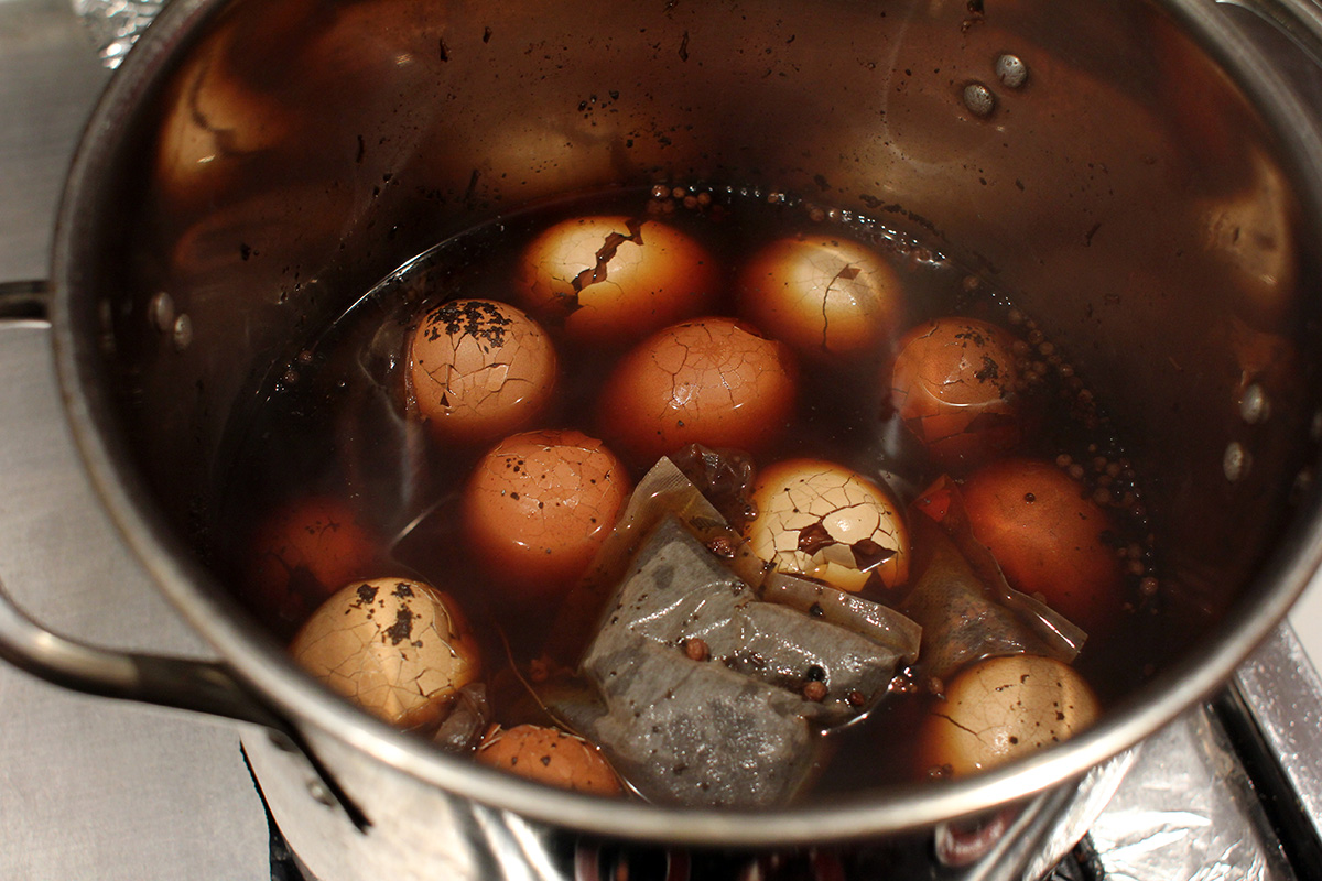 i made 30 tea eggs. i followed the recipe i used a little more than 3 weeks ago. because it was a bit salty, i only used 3 tbsp of salt this time (instead of 4 tbsp) and i remembered to add 1 tsp of sugar to counterbalance the saltiness. it may end up being not salty enough, in which case it's an easy matter of adding a bit more sodium to the brine. i wonder if i made too much, but they're easy to make, and the ingredients are inexpensive as well (18 eggs were 99¢ a pack when they were on sale), so it makes sense to make a bunch.
