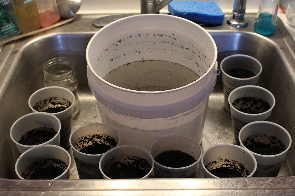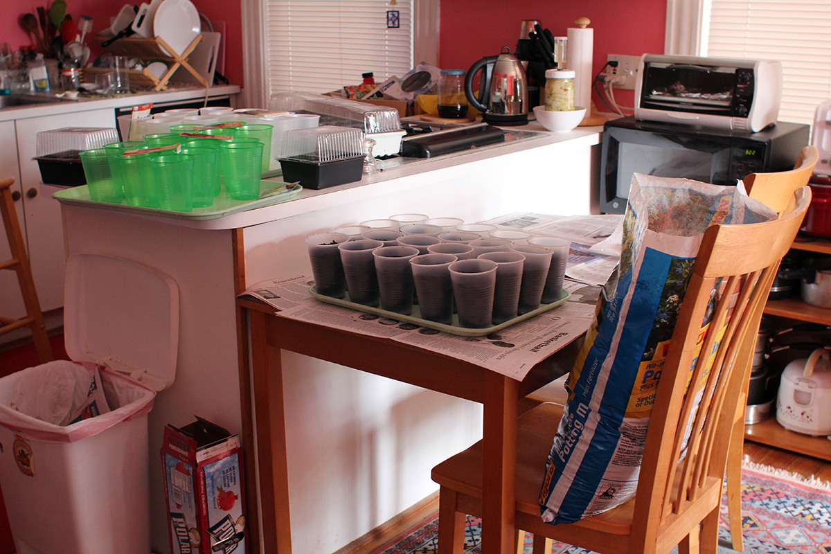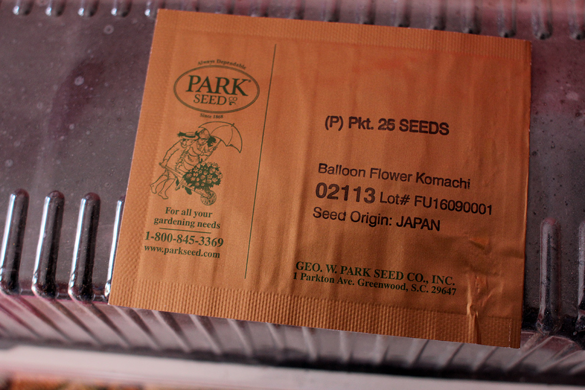 i planted some of the flower seeds earlier, because they were going to live in the starter trays. in the smaller trays (dozen cells each) i planted 2 types of snapdragons. they need light to germinate and prefer a cool environment so the best place for them was by the back door. of my longer starter tray (two trays of 18-cells each), i planted half columbine 'mckana giants' and half balloon flower 'komachi'. both flowers are winter hardy, and prefer a period of cold stratification in order to germinate, so i set them outside in a sunny spot. i got my balloon flower seeds from park, and they only gave me 25, so i was very careful about only adding a single seed per cell.