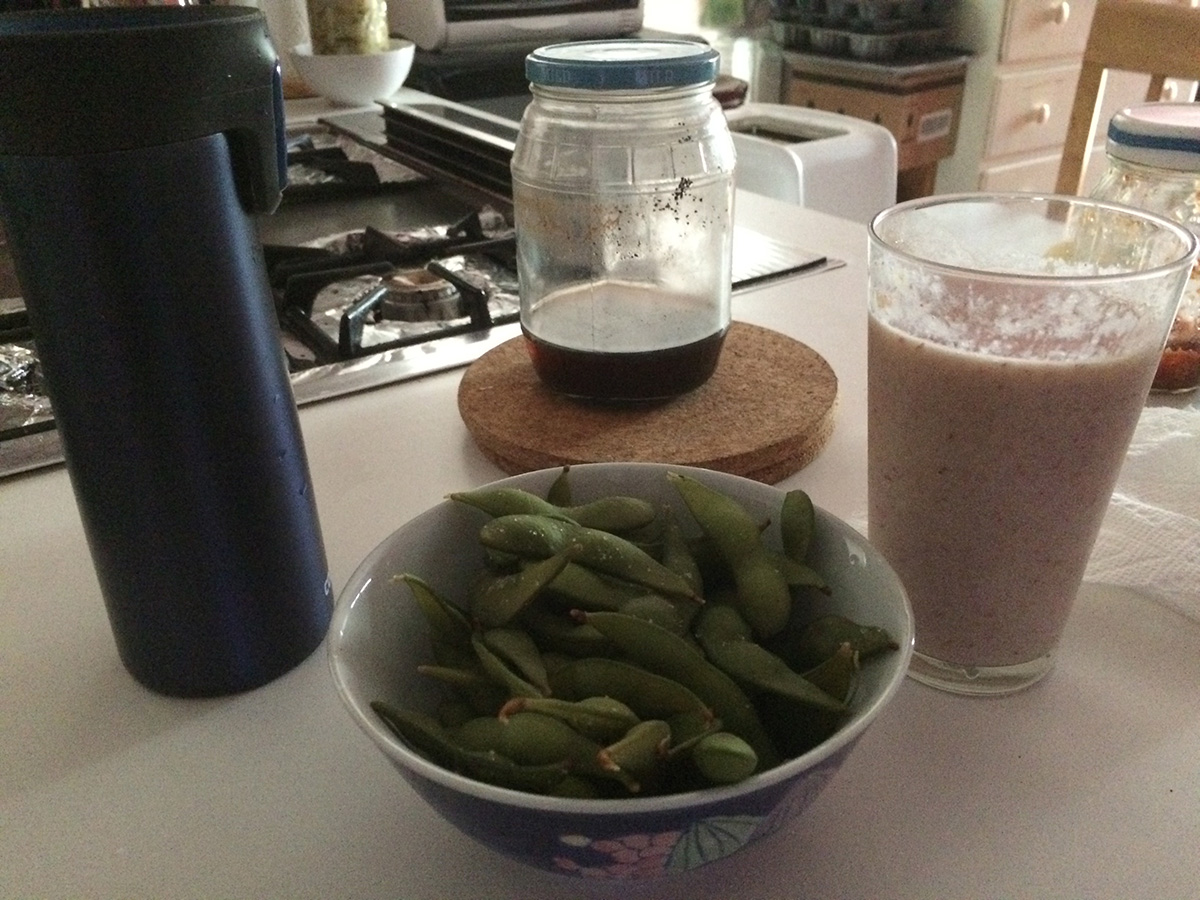 i found karen working in the living room this morning. i gave her some space, went to go use the bathroom, took a shower, then made breakfast: yogurt with granola, fruit smoothie, and cooked up some frozen edamame that's been in the freezer.